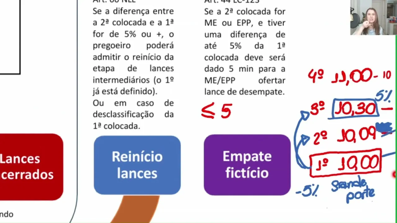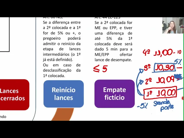 a microempresa ainda pode parar e pensar ela tem 5 minutos para decidir se ela quer ou não cobrir o lance da empresa grande isso é o desempate da microempresa então considera-se empatadas com a microempresa quando o primeiro colocado fo uma empresa grande e tiver uma diferença de até 5% vamos ver o que é que tá escrito então aqui na na doutrina no na legislação a respeito pessoal vamos aplicação das regras da Lei 123 Decreto Estadual 10247 encerrada a fase de lances em caso de participação de licitante que detea a condição de microempresa ou empresa de