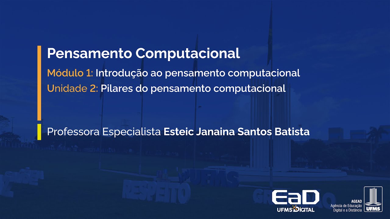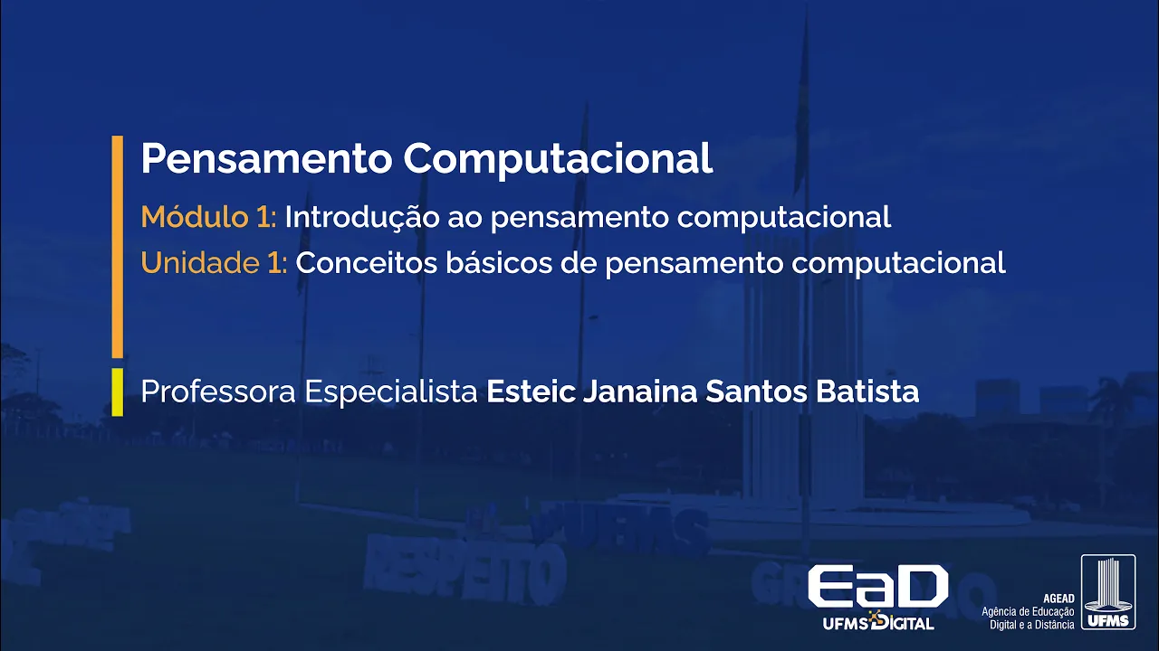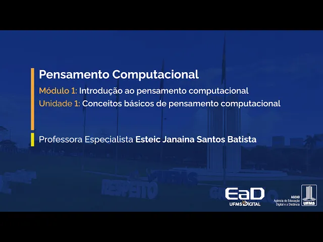 [Música] Olá seja bem-vindo à nossa primeira aula a disciplina de pensamento computacional na unidade um veremos conceitos básicos de pensamento computacional pensamento computacional ele é uma habilidade essencial para solução eficaz de problemas em várias áreas de conhecimento então ele propõe que a partir da aplicação de algumas técnicas de alguns Pilares né como decomposição identificar padrões administração e soluções algorítmicas eu consiga resolver problemas em diversas áreas de conhecimento Então apesar do nome pensamento computacional ele não se refere apenas a uma habilidade para ser desenvolvida com profissionais de computação e sim com qualquer profissional seja da área