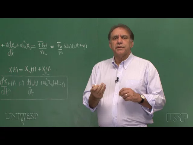 [Música] muito bem esta é equação fundamental para o oscilador forçado Então nós vamos considerar um caso particular de força FT é uma fora periódica que nós vamos escrever sobre a forma f0 xes seno de Ô t + phi e aqui eu tenho que dividir por m porque do lado direito eu tenho FT sobre m vamos estudar a solução dessa equação diferencial Estamos procurando uma solução x como função do tempo ou seja x de T ora a solução desta equação ela pode ser escrita da seguinte forma x de T é igual a x de T mas