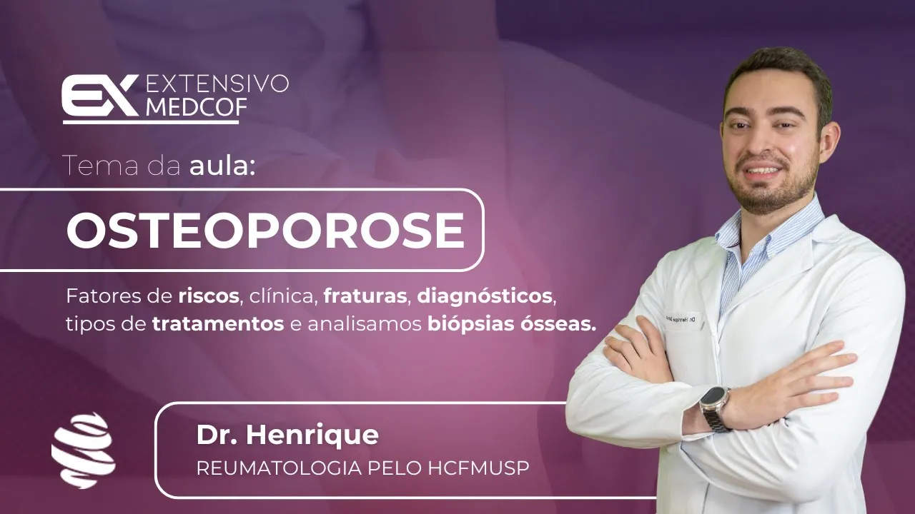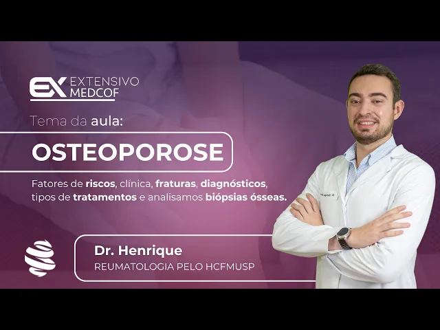 0 desvio os padrões do meu TS além disso em homens com menos de 50 anos de idade mulheres na pré-menopausa onde eu não consigo avaliar o t-score é um parâmetro não adequado para avaliação desse grupo de pacientes aí eu uso o ZS score e eu considero como baixa massa óssea quando eu tenho um ZS menor ou igual a menos do desvios padrão Além disso o raio x de coluna também tem uma função muito importante nesses pacientes se vocês notarem Olha como esse paciente aqui tem uma hipercifose torácica acentuada se vocês notarem ele tem inúmeras fraturas aquele de coluna torácica ah especificamente existe uma variável Na verdade uma métrica que eu consigo avaliar através da radiografia de coluna as minhas fraturas vertebrais que é o método de guenan eu considero como sendo fratura vertebral grau um aquela que tem uma perda de altura que pode ser tanto anterior quanto média quanto posterior de 20 a 25% e eu considero o grau TR aquele grau mais avançado quando eu ten uma perda de altura maior do que 40% por exemplo aqui na frente eu tenho 0,6 cm aqui atrás eu tenho 1. 1 cm eu tenho uma variação por perda por acunhamento por fratura maior do que 40% Ou seja eu tenho uma fratura é Graal TR excelente né então já falei para vocês que o que eu quero é justamente evitar que esse senhor aqui caia e frature principalmente quadril ou Claro lembrem né radiod distal húmero proximal pelv e coluna Existem várias linhas de tratamento eu vou começar falando para vocês do tratamento não medicamentoso tratamento não medicamentoso é baseado em cálcio na dieta idealmente entre 1000 a 1200 MG por dia de cálcio Ou seja eu preciso ter uma ingesta de leite e seus derivados de forma adequada aqui não entra aquela questão toda que o pessoal fala de dieta antiinflamatória de cálcio não não levem isso pro seu paciente com osteoporose ele precisa de cálcio na dieta ele precisa ter ingesta adequada além é claro eu preciso ter uma ingestão adequada tanto de vitamina D quanto de vitamina k a gente tem mais evidência com a vitamina D inclusive nas formulações com alvo acima de 30 a questão dos exercícios físicos é fundamental eu preciso fortalecer principalmente esse meu osso cortical que é meu osso do colo de fêmur e fêmur Total ou seja exercícios principalmente com fortalecimento local são ideais eu quero só reforçar que o paciente com osteoporose principalmente com acento de coluna não pode realizar aqueles movimentos de hiperextensão e hiperflexão de coluna pelo risco de novas fraturas locais Além disso como todo bom geriatra a gente precisa prevenir quedas nesses pacientes quando eu vou falar agora dos tratamentos para vocês eu falo especificamente primeiro dos medicamentos antire absortivos especificamente nos antire absortivos a gente tem três classes os moduladores do receptor de estrogênio os bisfosfonatos e os inibidores do rank ligante Na verdade o inibidor do rank ligante quando a gente fala de sermes ou seja aqueles que são o o moduladores do receptor de estrogênio eu tenho duas medicações no mercado Tamoxifeno e o raloxifeno eles têm alguma utilidade mas não são muito práticos principalmente para ganho de massa óssea no quadril os bisfosfonatos esses sim tá clássicos vocês já conheceram da faculdade provavelmente sua avó usa um bisfosfonato é bom porque ele é barato e fácil de tomar existem tantas formulações orais O alendronato que é semanal O risedronato que é mensal quanto a formulação endovenosa que é o ácido zor andrônico que é anual vejam eles são fá baratos de ser tomados e tem uma ação no osteoclasto Então quais são as principais contraindicações se esse paciente não tem uma via oral adequada por exemplo ele tem uma estenose de esôfago eu não vou conseguir atizar os orais parto então aí pr as minhas medicações endovenosas existe um imunobiológico tá o denosumab que já está H tempos no mercado o nome comercial a prolia que ele age em uma via através da inibição do rank ligante isso acaba levando a aumento de massa óssea proteção da degeneração e da perda de massa óssea então notem ã o denosumab também é uma opção anti reabsortiva vejam anti reabsortiva ele vai inibir a reabsorção então quando a gente fala de antire absortivo a gente conversa dos cermes dos bisfosfonatos e do inibidor do rank ligante agora dos anabólicos aqui eu quero literalmente ó força ficar forte fazer anabolismo crescer osso quando que eu indico e quem eu indico naturalmente eu indico para aqueles pacientes com osteoporose grave em geral com TS menor igual a-3 aqueles paci que tiveram falha terapêutica caracterizada por novas fraturas em vigência do tratamento antire absortivo habitual e naqueles que são intolerantes aos bisat seja na sua formulação oral seja na sua formulação endovenosa Vejam a teriparatida teriparatida que envolve o metabolismo do PT é uma medicação ótima como anabólico mas ela tem um porém é subcutânea e diária a utilização que a gente tem em bula é de 2 anos ou 24 meses por fim a gente tem um imunobiológico novo que tem uma função tanto anabólica que é o romz umag quanto antire absortivo ele tem uma ação dupla tem uma vantagem Eu particularmente gosto bastante de utilizar aqueles pacientes graves tem escol menor ou igual a -3. 0 que tem fraturas de repetição em vigência do tratamento ele é fácil por ele é antire absortivo e anabólico a gente pode utilizar ele de forma mensal são duas seringas por período de um ano qualis que são os take home messages que eu quero levar aqui para vocês o principal é a gente precisa reduzir o risco de fraturas com isso eu vou levar uma menor mortalidade a uma menor morbidade desse paciente e uma redução de custos seja pra família seja pro sistema bom vamos fazer uma questão essa aqui é uma questão que eu separei para vocês porque eu particularmente achei muito interessante eu tô falando de uma mulher d