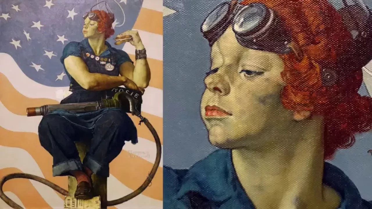 [Music] we're at the Crystal Bridges Museum of American art looking at an American icon Norman Rockwell's painting of Rosie the Riveter from 1943 we see this woman who is muscular and tough and wearing goggles and eating a ham sandwich and wearing denim overalls that iconic image of the support that women lent on the home front for World War II thousands and thousands of women entered the workforce during the war men went to serve in the war and women served their country by going to work taking the place of men if you were able to see