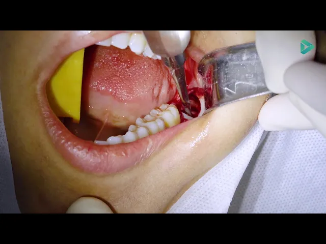 lado também a gente pode fazer um descolamento na superfície lingual para que a gente tem a proteção dos tecidos linguais na região de modo que a gente evite danos ao nervo igual que passa logo adjacente a face lingual da mandíbula e após a exposição de toda a coroa nós fazemos então uma primeira canaleta vestibular utilizando uma broca esférica número 6 sobre irrigação abundante para que a gente tem a refrigeração do tecido ósseo ea remoção de detritos ósseos que vão sendo removidos durante a osteotomia para que a gente começa e o procedimento de expansão dilatação desse