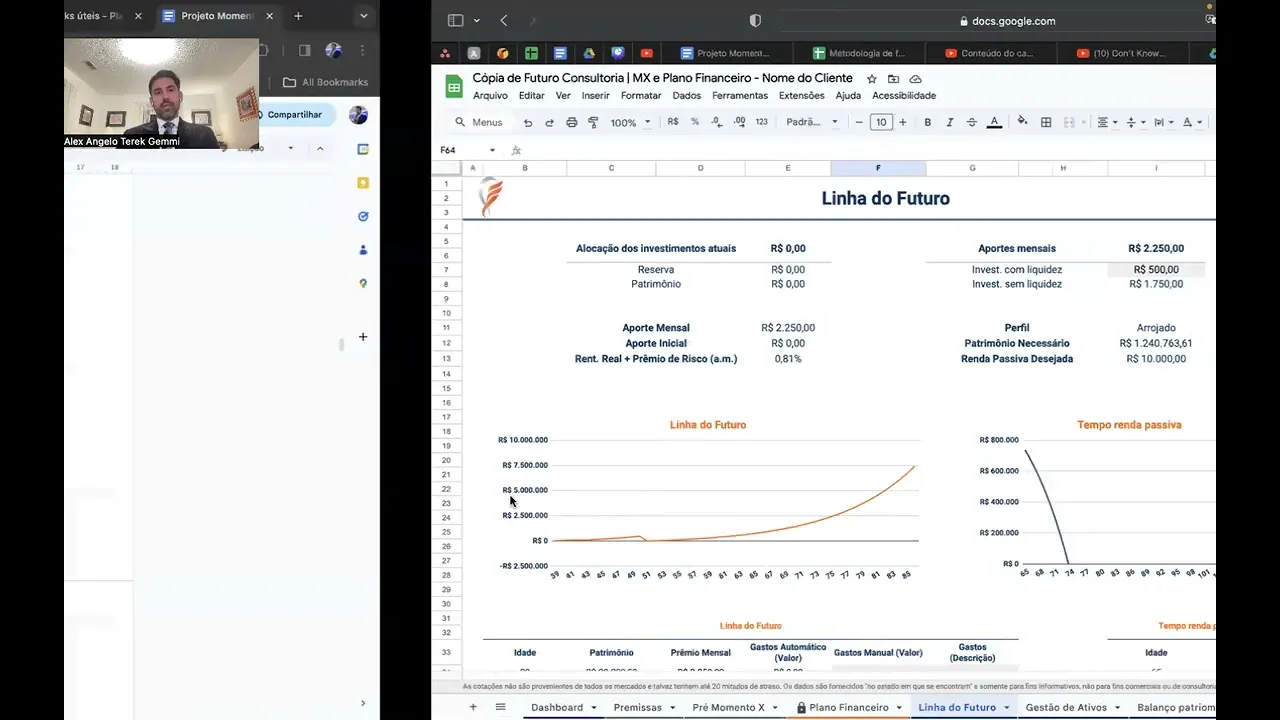 Fala parceiro futuro vamos lá vamos dar continuidade aqui na apresentação do momento x a gente vai ver agora a terceira parte terceiro bloco aqui de de como fazer a apresentação a gente viu até agora bloco um vimos agora no último vídeo bloco dois agora a vai falar do bloco três que é o slide 6 a etapa se que vai falar dos prazos as novas metas a linha do tempo tá E aí a gente vai entrar no plano de ação que aí é complementar os oito passos trazendo as soluções para alcançar ou realizar esses Passos aqui vai de 20 a 40 minutos essa etapa Então vamos lá acabei de explicar aqui os oito passos Acabei de explicar as estratégias acabei de falar dos objetivos em detalhes E aí eu vou entrar no assunto mais profundo que é o assunto da nossa ponto Agora que é os novos prazos as novas metas então o cliente falou que ele tinha objetivo de comprar o carro em um ano cliente falou que com os r00 ele precisa construir reserva de emergência a gente viu como necessidade ele quer construir dependência financeira a gente viu também como necessidade a gente também traz aqui para ele a visão né desse ponto que não é só esses objetivos tem as outras áreas da vida que tem que se atentar também né que a gente vai falar então para essas novas metas a linha do tempo compare os cenários com o cliente deixando claro que o planejamento financeiro o farar alcançar seus objetivos em menos tempo e aí você vai fazer essa parte então agora a gente vai entender que o cenário financeiro atual para alcançar seus objetivos hoje você PPA r00 que você comentou né Se continuar assim você vai conquistar os seus objetivos né a casa por exemplo ela vai ficar pronta o dinheiro você vai ter o dinheiro PR casa com 55 anos de idade se você não comprar o carro mudar a estratégia a casa vem 3 anos a menos né Isso mostra o quê que você consegue conquistar mais rápido definindo prioridad né se por acaso seu objetivo sua prioridade realmente é o carro a casa fica nesse prazo não em outro eu vou explicar para você também como comprar essa casa qual que é a melhor forma para comprar sua casa as próximas explicações então a separou para você um plan dentro do planejamento quanto que você vai direcionar para acumular para cá casa tá então se a gente continuar assim você vai conquistar seus objetivos todos eles todos eles até conseguir se aposentar e precisa de 1. 8 milhões com 78 anos de idade então com o seu perfil de investidor com seu seu potencial de acúmulo hoje né com os seus objetivos com que o mercado oferece rentabilidade seria Nessa idade para conquistar todos os seus três objetivos e claro Poxa o carro não tem tanta necessidade assim agora talvez mais para frente aí o cenário pode mudar todo aqui tá E aí você vai explicando pro cliente agora faz mais sentido poupar mais né Guardar mais que muitas pessoas acham né você pode vir até pré momento x quando você preencheu aqui os objetivos do cliente os gastos do cliente as pessoas acham que 1% a mais rendimento vai fazer a pessoa alcançar o objetivo mais rápido sim vai ajudar mas a grande diferença que vai dar eu vou explicar para vocês aqui ó imagina PR gente tem aqui ó telefonia gasta 400 aí com poucas dicas gastar menos tarifa banco 80 vai zerar cartão também gasta aí dois cartões vai zerar juros paga aí uns 200 por mês de juros vai se organizar ter planilha vai pagar mais nada de juros lazer então o cliente vamos supor que tá gastando 2. 000 com lazer hoje você vai ajudar ele guardar só 10% disso Olha só o impacto disso tá fazendo poucas mudanças aqui também tem um parceira da futuro luzente paga 300 de luz ele vai economizar ali 15% então a gente tá falando que cliente vai economizar mais 45 então de poucas mudanças de comportamento sem procurar o investimento milagroso que 5% ao mês que não existe tá Dá 745 de economia no ano pro cliente dá r$ 9.