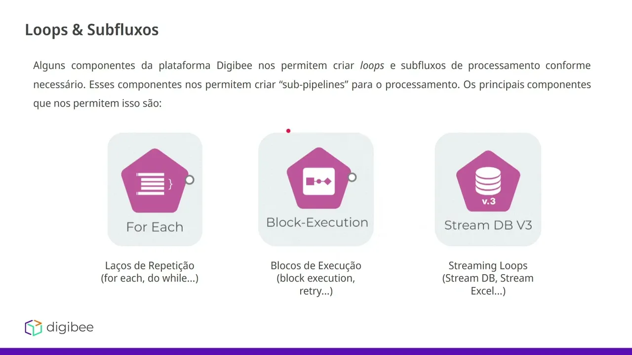 Olá esse é o integration developer Camp estamos na etapa de boas práticas de desenvolvimento hoje falaremos sobre componentes de Loops alguns componentes da plataforma de B nos permitem criar Loops eflux processamento conform necessário esses componentes nos permitem criar sub pipelines para processamento e os principais componentes que nos permitem isso são Block EB os únicos componentes de loop nessa imag são o for ndb Block execution não é um componente de loop ele é apenas um componente que possui a tecnologia de subfluxo falando do farit componente farit Recebe como um parâmetro um Array cada item desse Array