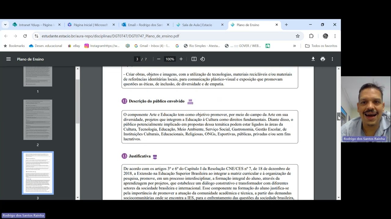 assim como pedido né galera um vídeo aí pr vocês do preenchimento do projeto de extensão aí da faculdade está Vou tentar trazer aqui para vocês de forma mais clara bem objetiva e direta Carol onde é que eu encontro aqui né para não mostrar o ambiente do aluno Eu já entrei na disciplina lá a parte Inicial onde aparece as disciplinas você vai procurar onde é que eu procuro para saber ent e vai procurando alguns alunos terão uma duas três até mesmo quatro extensões depende muito e você tem que trabalhar conforme o seu plano de ensino o que é o plano de ensino Carol tá vendo aqui pessoal abaixo aqui de responsabilidade social aqui tem plano de ensino vai baixar esse plano de ensino aqui do lado baixou o que você vai encontrar é este material aqui tá vendo de orientações só que Pelo que eu entendi você tem que seguir as linhas e eixo de extensão e pesquisa né Por exemplo esse aqui tem gestão de projetos eu vou escolher esse eixo aqui né e vou escolher um dos temas que estão aqui abaixo Carol encontrei essa parte aqui Pessoal espero que eu não esteja errada mas eu acho que essa parte aqui está desatualizada por quê Porque esta parte aqui procedimento de ensin em aprendizagem onde aparece um certo roteiro ele é parecido com antig antig extensão que não era o laboratório neste caso que esse extensão que era o antigo a gente seguia Realmente isso aqui agora não agora você vai fazer pelo laboratório virtual de extensão Então não precisa seguir esses Passos aqui até então não né A não ser que atualizarem eu vou deixar aqui nos comentários para vocês todas as atualizações relativas a este vídeo Então vai acompanhando entendeu quando tiver notas também em relação a essa metodologia que eu estou utilizando também vai aparecer aqui para você eu vou postar aqui para vocês pessoal siga Tá beleza tá ok Entendeu vamos lá onde é que eu encontro aqui né no plano de ensino e tá os temas né que eu posso trabalhar aqui também tem uns temas né pessoal aqui ó tema um tema do meu ambiente por aí vai é laboratório virtual Aí você vem aqui em laboratório virtual laboratório de extensão você vai ser direcionado para um ambiente externo Aí você vem aqui ó Ei Jesus quando você entrar no laboratório de tensão vai aparecer isso aqui o que é importante aqui vocês não esquecerem de preencher todos os itens porque se você não preencher você não vai conseguir acessar vem aqui ó título pessoal tem muita gente que não que tá esquecendo inclusive no meu último vídeo que eu gravei eu não coloquei o título como eu não coloquei né eu at alizando aí para vocês Vocês precisam criar um título para essa extensão de vocês aí vem quando vocês entrarem aqui vocês vão ver ó aí vem nessa parte aqui ó identificação aí vem inserir texto aí vem exibir mais aí vai aparecer né para vocês desão da atividade você vai descrever esse público alvo que é a faixa etária desse público alvo que você pretende eh aplicar o extensão o local entendeu outra introdução que eu já tem um vídeo explicando sobre isso aqui que eu vou enfatizar isso aqui para vocês é o seguinte é obrigatório não é uma opção é uma obrigação quem entrou a partir de 2023 tem obrigação de realizar o projeto de extensão há algumas faculdades que eu não sei se é o caso da estáo que tá obrigando até mesmo quem entrou antes e ainda não formou terá que realizar essa extensão entendeu 10% da sua carga horária Então vai ter aluno a com 300 400 500 600 horas ponto final vai ter que cumprir e vai ali aprendendo a a responder com tempo entendeu Vou deixar esse vídeo aqui para vocês explicando né o passo a passo como já falei vem aqui identificação aí vem no 1. 2 todos eles tem o que você deve preencher aí vem exibir mais aí eles D exempl são exemplos Mas você pode o material que tá lá no seu plano de ensino os temas que estão lá e eles dão as orientações olha que legal olha aqui 1. 3 demanda né ol você ver ele sempre dão as ideias conforme seu tema então vocês podem utilizar esse exemplo aqui porque não tem para onde correr é melhor vocês seguirem o o laboratório virtual e responder pelo laboratório virtual do que pegar o o plano de ensino o que que oriento pega do plano de ensino simplesmente os temas que podem ser trabalhados os temas também tá naquela parte Inicial lá em cima antes de de apertar em plano de ensino lá tem né o os temas também que você pode trabalhar e siga aqui o exemplo que eles estão dando não Copie o exemplo deles Lógico que não Mas use como exemplo para poder preencher os de vocês se vocês estão segando no laboratório virtual estão segando o exemplo que eles estão dando entendeu ou adaptando conforme o tema que você escolheu que tem a relação com a disciplina que tem relação com os temas de aprendizagem Por que que eles vão negar entendeu a gente pode ter direito de entrar com recurso seguindo tudo certinho Carol onde é que eu posso aplicar esse meu projeto eu posso aplicar esse meu projeto em escolas em igreja até no quintar da sua casa você pode fazer convidar uma galera 8 9 10 pessoas colocar no quintal da sua casa e falar com a associação de bairro entendeu belezinha no seu próprio trabalho entendeu E E aqui Pessoal vocês vão preenchendo preencheu ok saltando que esse trabalho não não en vend em PDF A única coisa que você pode colocar em PDF aqui ó são as evidências que aqui ó você vai colocar as evidências Ah tá e uma coisa que tá me pedindo de ver tava me pedindo de ver ao trabalho é que quando eu colocar as evidências eu preciso escrever aqui também aí depois que eu venho e anexo arquivo né coloco arquivo aqui e anexo o meu PDF com as minhas imagens né eu posso fazer um slide eu posso fazer uma reunião online eu tô falando reunião online recomendo mas tipo assim se a faculdade está disponibilizando essa possibilidade Por que