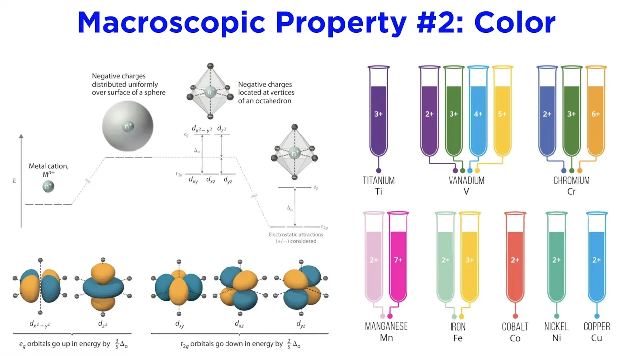 Color, one of the most obvious properties of a mineral, is also the easiest to misinterpret. Minerals typically get their coloration from the presence of transition metals. Due to their partially filled d-orbitals, transition metals are very efficient at absorbing specific wavelengths of visible light, which affects the color that is reflected off a mineral’s surface into your eye.