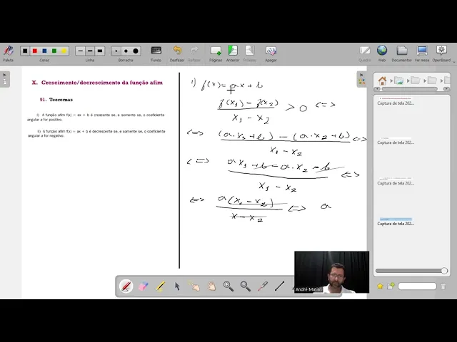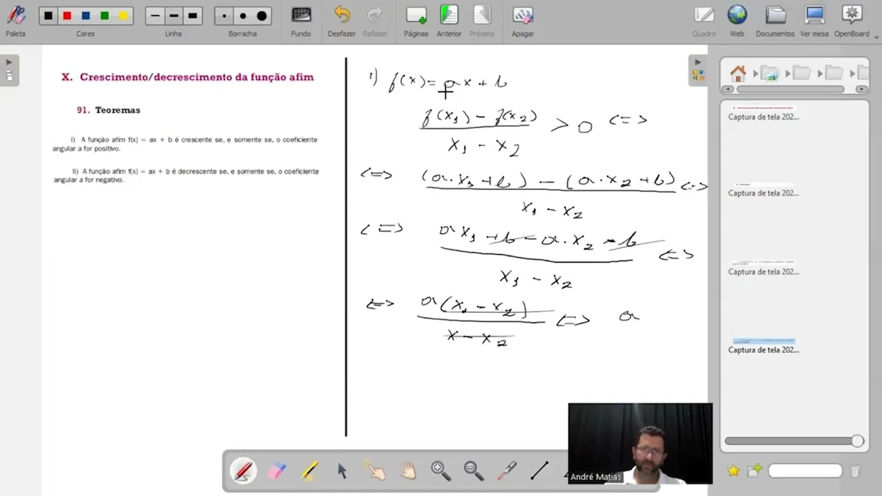 [Música] Olá pessoal nesse vídeo de hoje vamos falar sobre crescimento e decrescimento de uma função Aim e para falar sobre crescimento e decrescimento vamos falar sobre dois teoremas primeiro teorema a função afim Ax + B é crescente Se e somente se o coeficiente angular for positivo e o segundo teorema é a função Aim fx = X + B é decrescente se somente se o coeficiente angular for negativo Então vamos lá vamos para demonstração o teorema um F Dex é igual a ax + B ela é crescente se somente se fx1 - fx2 dividido por X1