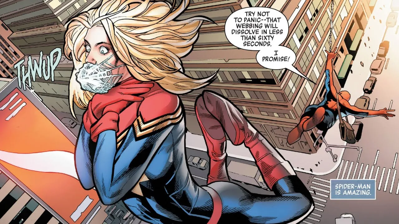a trick up his sleeve he pops a capsule into her mouth and fills it with web fluid as he escapes he reassures Captain Marvel that the webbing will dissolve in less than 60 seconds Spider-Man breaks into an office as he's making his move he comes face to face with blade they started fighting black panther also joins the fight Blake grabs Spider-Man and says let's see you bounce around now Spider-Man replies bouncing around is only part of what I do black panther then kicks Spider-Man and says we don't want to hurt you Spider-Man Captain comes from