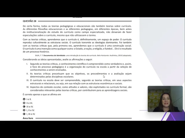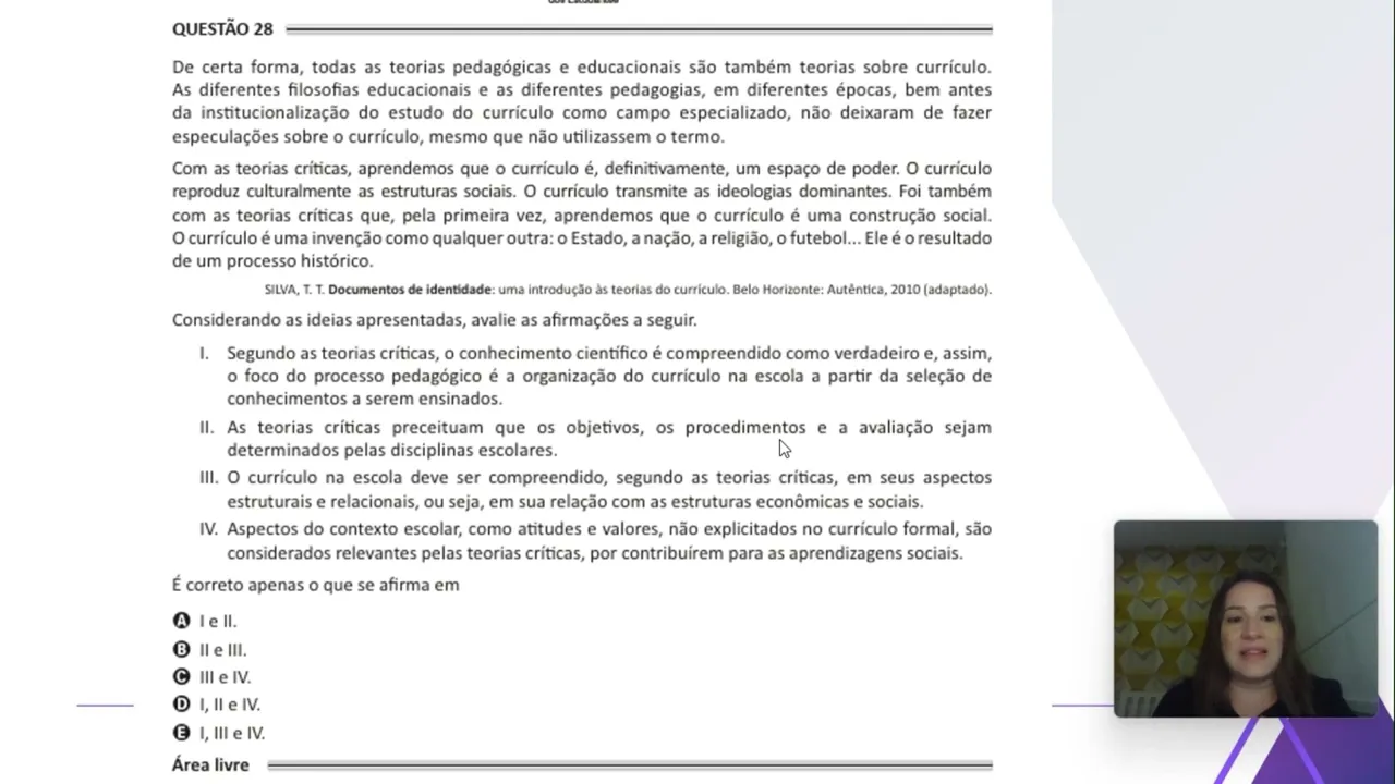 [Música] Olá caros alunos tudo bem Eu sou a Professora Doutora Camila tecla e neste vídeo eu vou analisar com vocês uma questão vamos lá essa questão ela é do enad do ano de 2017 e ela se refere aos conhecimentos específicos que vão eh se referir à formação de professores então vou fazer a leitura com vocês dessa questão e depois nós vamos fazer a análise das afirmativas Eh vamos começar pelo enunciado de certa forma todas as teorias pedagógicas e educacionais são também teorias sobre currículo as diferentes filosofias educacionais e as diferentes pedagogias em diferentes épocas bem