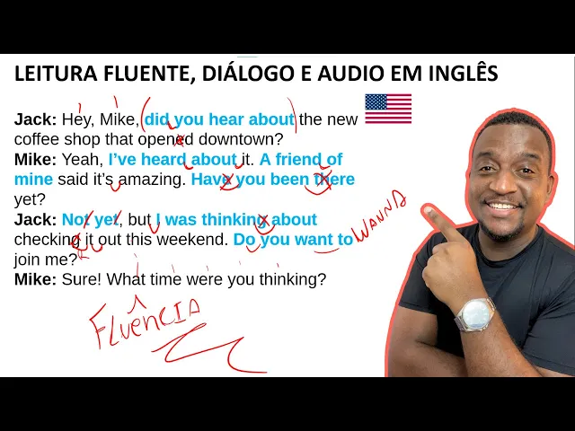 vocabulário pronúncia compreensão e fala é isso que você vai encontrar Nesta aula mas eu vou logo te avisando se você colocar isso aqui em prática a fluência será inevitável Então vamos pra nossa aula Beleza então vamos lá que a gente tem um diálogo entre o Jack e o Mike Jack e o Mike Jack and Mike vamos lá primeiro ele diz assim he coffee shop that Open Downtown ou seja Ei Mike você ficou sabendo do novo café que abriu no centro é isso que ele quer dizer mas vamos lá pronúncia como deixar isso aqui natural isso