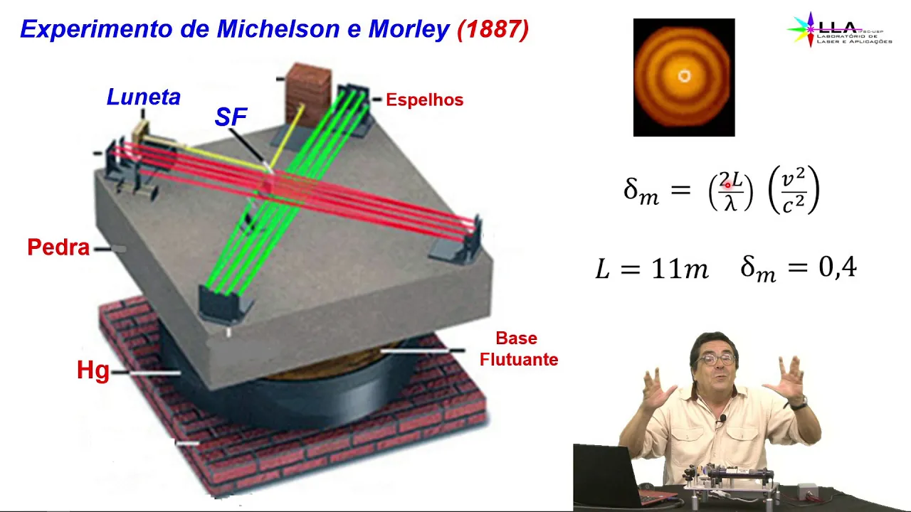 aí ele ia ficar olhando aqui iria agir a isso ia ver aquela mudança tá certo se houvesse mudança tá certo realmente o éter existia certo tá E aí o seguinte Ele montou esse interferômetro tá certo isso aí não funcionava por quê Porque você não quer falar ontem muito leve sabe tudo qualquer vibração tá certo é suficiente para baixo franjas de tá trabalhando tá Como eu vou mostrar para vocês então isso aqui não deu certo eles desistiram desse experimento né mas todo mundo toda a comunidade científica da época queria saber se realmente o é que existia