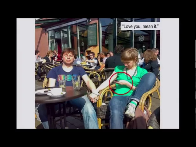 What this is doing is, we find a -- (Laughter) a direct collision -- we find a direct collision between availability -- and what's possible through availability -- and a fundamental human need -- which we've been hearing about a lot, actually -- the need to create shared narratives. We're very good at creating personal narratives, but it's the shared narratives that make us a culture. And when you're standing with someone, and you're on your mobile device, effectively what you're saying to them is, "You are not as important as, literally, almost anything that could come to me through this device.