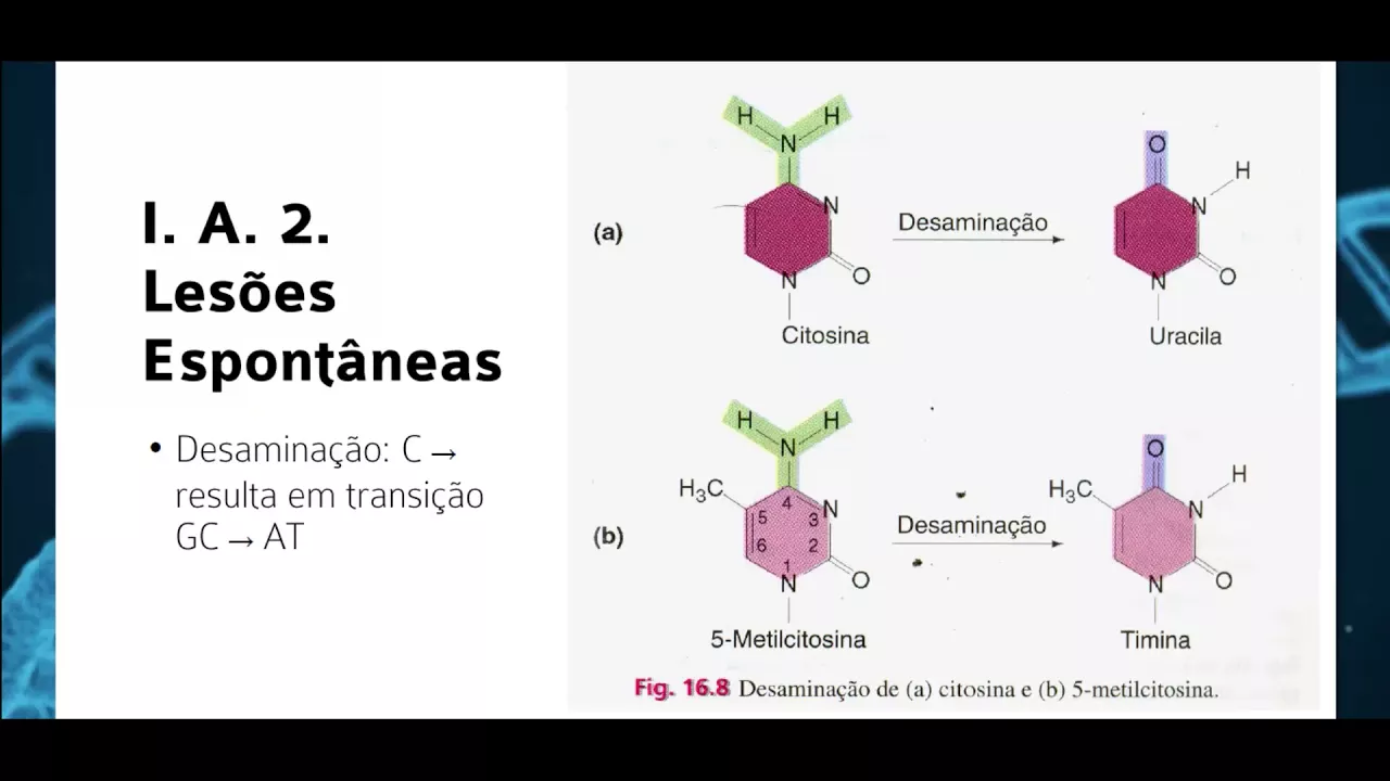 ligação do fragmento receita eternizado com o restante da molécula de dna bom outro tipo de lesão espontânea que pode ocorrer no denarc que acaba então gerando a mutação alteração de uma base pra outra no dna é são a é dita a desafinação é que isso a desafinação ocorre então a remoção do grupamento a mina das bases nitrogenadas então aqui está sendo destacado nem verde o grupamento da mina de uma citocina e nessa desamina são então quando ocorre a remoção ocorre espontânea deste agrupamento na citosina a citosina é convertida em ouras hila como aura sila não