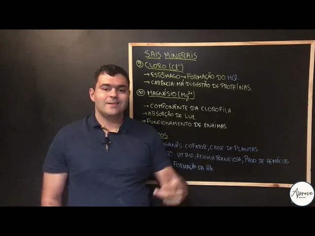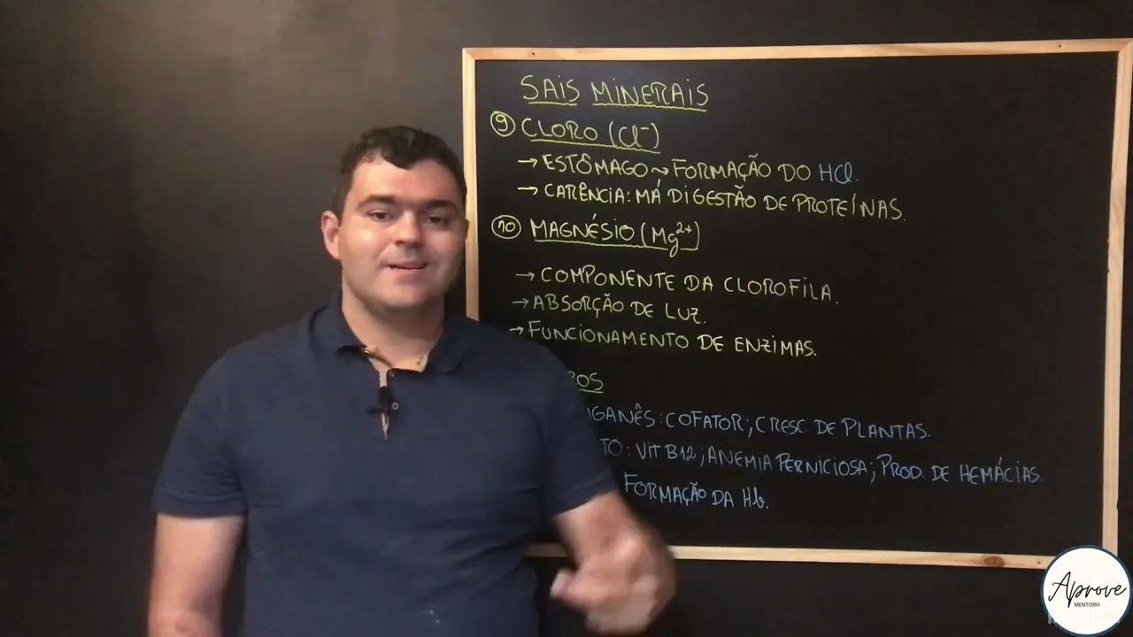 [Música] Fala galera ligada no projeto a prova e mentoria tudo bem com vocês por aqui Professor Pedro de volta seu professor de biologia do projeto e nessa vídeo aula vamos aí encerrar o estudo dos sais minerais e consequentemente o estudo dos compostos inorgânicos galera já demos todo um Panorama aí de Introdução ao Estudo da bioquímica celular falamos aí de água estamos falando aí já algumas vídeo aulas dos sais minerais e esse é o momento de nós encerrar os nossos estudos dos sais minerais falando demais alguns deles Mais especificamente aí de cloro Magnésio e alguns outros