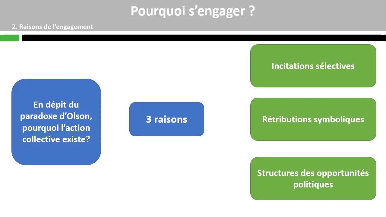 rationnelle pour eux de ne pas se mobiliser car les coûts encourus sont supérieurs aux bénéfices or si tout le monde raisonne ainsi il n'ya jamais d'action collective or de nos jours on voit bien l'existence d' action collective en dépit de ce paradoxe et de l'existence de comportements de passager clandestin comment peut-on expliquer que les individus alors s'engage quelles sont les raisons qui les poussent à se mobiliser on dénombre trois raisons les incitations sélective les rétributions symbolique et les structures des opportunités politiques la première raison expliquant la mobilisation des individus dans une action collective à est