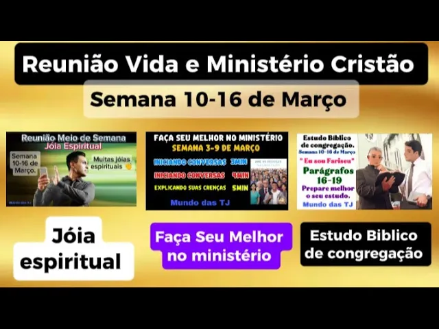 Olá meus queridos irmãos e amigos sejam todos bem-vindos mais uma vez aqui no nosso canal para juntos agora prepararmos uma parte importante de nossa reunião que é a reunião vida e Ministério Cristão da semana 10 a 16 de Março selecionamos algumas partes aqui da nossa reunião e tenho certeza que vai ser muito gratificante para nós então vamos para o nosso vídeo [Música] então sejam todos bem-vindos É um prazer imenso ter vocês aqui semanalmente para juntos prepararmos as nossas reuniões Como dito inicialmente estaremos fazendo agora jois espirituais da semana 10 a 16 de Março que se