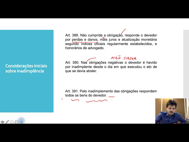 e sass tudo que está aqui na charrete carrega de carregando aí sobre a obrigação é justamente são as sanções relativas ao não cumprimento da obrigação é o psol considerações aí importantes do que vem a ser a inadimplida a inadimplência no artigo 38 9 nós temos o seguinte que não cumprida a obrigação ou seja o vendo a inadimplência da obrigação responde o devedor por perdas e danos chamado na em juros e atualização monetária segundo índices oficiais também regularmente estabelecidos e também chamados honorários de advogado então nós temos aqui pessoal que não cumprido essa obrigação o devedor