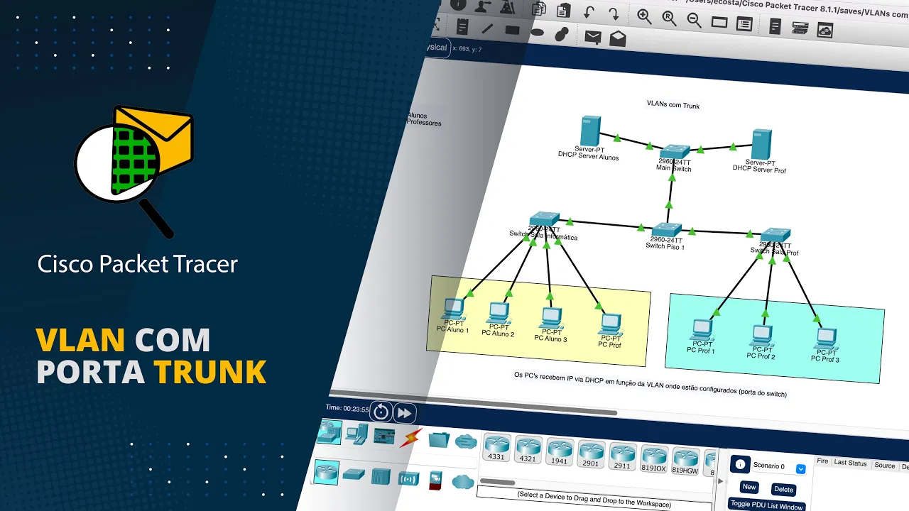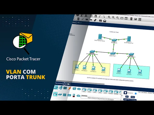 Olá a todos bem-vindos a mais um vídeo aqui no cisco Packet tracer Neste vídeo vamos dar continuidade ao trabalho que fizemos no anterior que está relacionado com velanes eu vou já colocar aqui o título do nosso projeto para ser mais fácil então nós vamos usar velanes com trank na verdade as velanes como vimos anteriormente são usadas para dividir uma rede em diferentes grupos de dispositivos por exemplo baseada em funções ou departamentos e para depois segmentar a rede vai estar segmentada ou seja vamos ter neste caso vamos ter uma rede para alunos e vamos ter uma