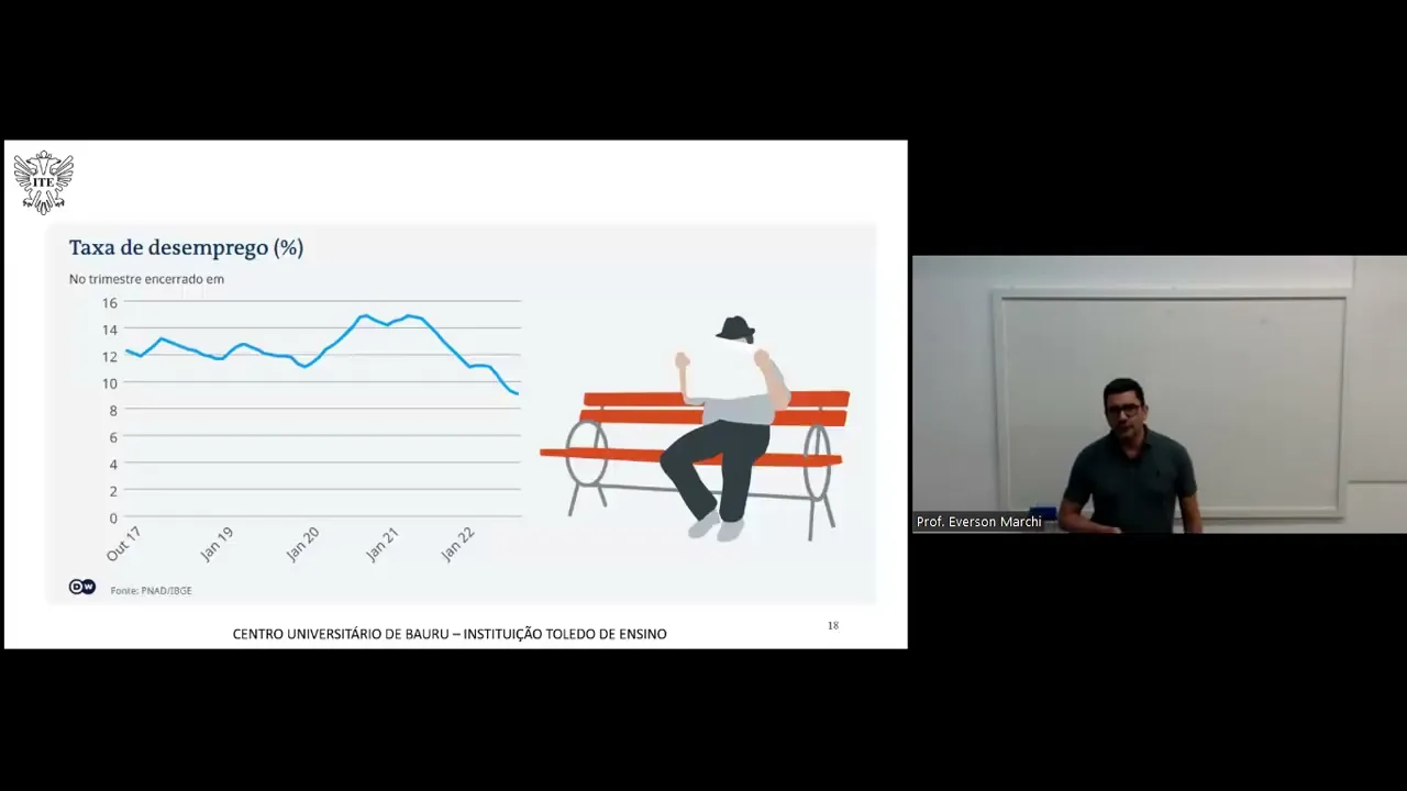 E aí pessoal tudo bem vamos lá mais dando uma vamos continuar aí com as nossos estudos aí da economia brasileira contemporânea e hoje a gente vai falar um pouquinho sobre o contexto né do governo bolsonaro do período de 2019 a 2022 nesse período a gente vai achar um um problema que ocorre né no no mundo inteiro a nós tivemos aí o problema com relação à pandemia então no dentro desse desse período 19 a 22 principalmente no período de 20 e 21 é justamente onde o Brasil sente mais esse esse problema com a pandemia né todos os países sentindo mas o que é o período que a gente tem os resultados aqui do reflexo da pandemia no país esse material que a gente vai trabalhar eu tô utilizando um um artigo do Bruno lupion de São Paulo vou disponibilizar para vocês também no no material e vocês eh isso Vai facilitar um pouco a o entendimento vou trabalhar também com os gráficos para facilitar os resultados né O que que foi ocorreu nesse período do do do governo bolsonaro e e fica mais fácil também da da da gente entender né esses impactos que ocorreram principalmente com relação à pandemia aqui no governo e o que isso trouxe né de de de resultados positivos ou negativos dentro da economia então no início do governo bolsonaro a gente vem aí de um PIB fraco né e índices estáveis por conta da do período anterior do do do temer eh depois uma alta de pobreza desemprego e desigualdade em parte devido à pandemia guerras e decisões e políticas e logo em seguida recup ação né no no finalzinho do governo mas que não compensa todas as perdas que nós tivemos nesse período então a gente pode eh dividir o governo bolsonaro nessas três partes né a um governo fraco e os índices estáveis a inflação controlada e uma taxa de juros em queda entre a pandemia nós temos aí a aumento da pobreza desemprego desigualdade guerra e e também decisões políticas impactos aí com por conta das dos impasses políticos que ocorreram e lá aí no finalzinho mais do do do do período algumas recuperações mas não Que compense todo todo esse essa esses dados eh que a gente perdeu um fato no com relação ao governo bolsonaro na aula passada a gente comentou sobre o governo temer né a contração segurar as despesas controlar as despesas para não aumentar os o déficit que já já ele já tinha eh herdado lá do governo Dilma no governo bolsonaro a gente também vai ter no início do governo essa essa preocupação do da equipe de governo em Manter o controle desses gastos né ou das políticas fiscais eles vão eh buscar eh esse esse equilíbrio né e de uma forma assim até um pouco mais eh radical né eles buscam eh esse equilíbrio a gente tem uma ruptura quando começa a a pandemia que os o governo ele precisa gastar principalmente com vacinas com com outras eh em outras eh outras frentes para poder proteger a população e no final do governo a gente vê uma inversão né o governo ele abre um pouco mais a mão ele eh começa a a gastar um pouco mais e como reflexo disso a gente tem uma melhora uma pequena melhora nos resultados aí apresentados nesse período então a evolução dos indicadores socioeconômico eh 2019 o primeiro ano de gestão é marcado por fac crescimento econômico inflação sobre controle e desemprego relativamente estável né a gente tem lá eh a estabilidade de alguns indicadores nos dois anos seguintes com o impacto da pandemia né que aumenta aí a recessão e o desemprego em alto e no quarto ano então influenciado aí também pela guerra da Ucrânia e alta inflação desemprego no primeiro semestre e melhoras aí no segundo mostra também uma piora sensível na distribuição da renda para população desigualdade de renda e da pobreza atingindo aí seus piores valores desde o início da série de 2012 eh do crescimento econômico nós temos aí o o PIB né que é a a medida aí da das riquezas produzidas no país ele ele aponta afirma aí que o baixo o segundo o ex-secretário de acompanhamento econômico do Ministério da Fazenda Cláudio considera eh ele afirma que que o baixo crescimento 2019 pode ter sido atribuído a um clima de caos institucional né isso espanta consum o o consumidor e o empresário a gente fica naquela insegurança se você vai gastar você não sabe qual que vai ser eh os os os novos dados os novos caminhos da economia e acaba nem o consumidor gasta com medo de de perder o emprego né dessas situações que dessa vulnerabilidade que o consumidor fica qu quando a a a economia tá desequilibrada E os empresários também não não vão investir não vão gastar investimento porque eles não sabem como que vai tá o resultado da economia Então essa instabilidade gera né uma queda da da dos investimentos e aqui a gente tem evolução do PIB desde setembro de 2017 dezembro de eh Janeiro de 2019 então quando começa o o governo né e o fechamento lá até Junho de 2022 então nós temos uma queda aqui principalmente em 2020 que é o reflexo aí da pandemia e depois ele volta a uma uma linha de crescimento e finalizando aí começando a cair novamente em junho de 2022 então 2020 com a pandemia entra em retração o PIB né e termin o ano em 3. 9 eh positiva aí no final do do período eh is que já comentei o custo de vida relacionado aí então Aos aos gastos né ou a inflação da que é medida nesse período quando a gente fala custo de vida eu tô tô me referindo ao ao custo né do do do dos gastos como que ele variou e aí a gente vai buscar justamente lá na inflação Então os dois primeiros anos do governo registra uma inflação sobre cont cont próximo aí da Meta determinada do do do governo né que de 4:25 e 4 em 2020 com margem meio para cima meio para baixo em 2021 que é no segundo ano da pandemia os preços começam a cair sair do controle a vacinação contra o covid avança e os países voltam gradativamente a atividade Por que que a infração foge do controle nesse período nós est retoma