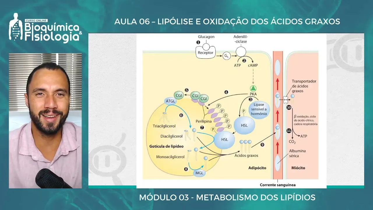 é a explicação mais complexa esse daqui é do livro de bioquímica ilustrada Esse aqui é do livro de lenninger vamos entender um passo a passo né são 11 passos até a oxidação Mas vamos lá o primeiro passo é a ligação do hormônio ao seu receptor aqui a gente tem adrenalina aqui a gente tem o glucagon se liga o receptor ativa proteínas GS né E que vai ativar uma enzima chamada denil ciclase o que que ela vai fazer pegar molécula de ATP quebrar em Amp cíclico que é um mensageiro celular esse MP cíclico vai falar gente