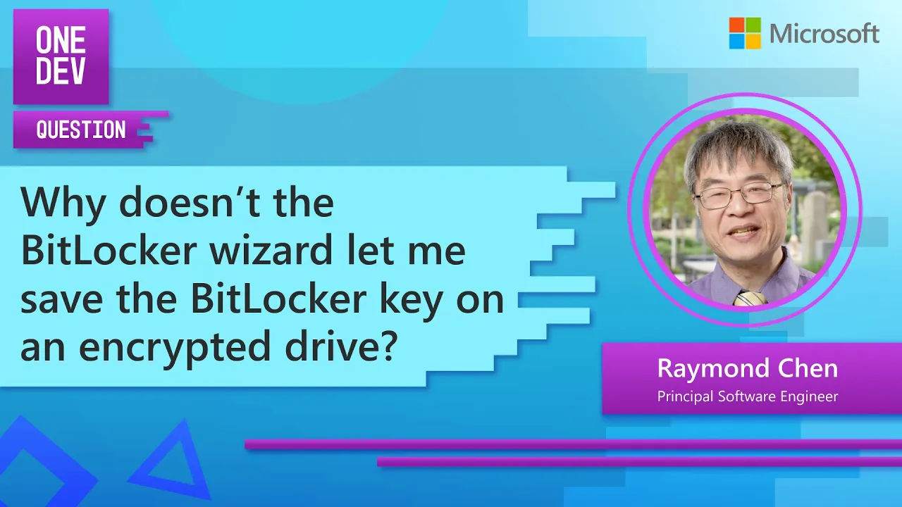 >> Why doesn't the BitLocker Setup Wizard let you save your BitLocker key to an encrypted drive? You would think that would be the best place for it. But it's actually not a great place for it in the sense that you're sort of locking the keys in your car.