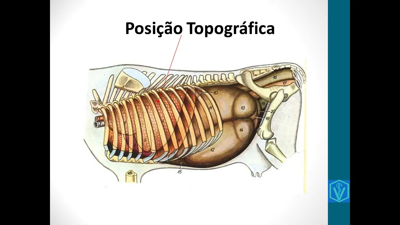 ele está localizado na caixa torácica nessa região da cranial diafragma e dependendo da espécie vai ter sua delimitação de acordo com o número de costelas mas o caso dos ruminantes em bovinos ovinos e caprinos possuem 13 pares de costelas e 12 espaços intercostais é muito importante a gente observar essa imagem aqui do bovino né que a gente vê ó essa delimitação então é a parte do sistema digestivo ela também adentra um pouco a ser a parte de costela ainda Cobre ela né que tô fazendo o resultado tem que ter essa delimitação aqui saber onde é