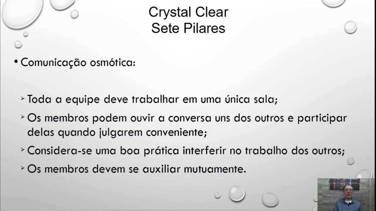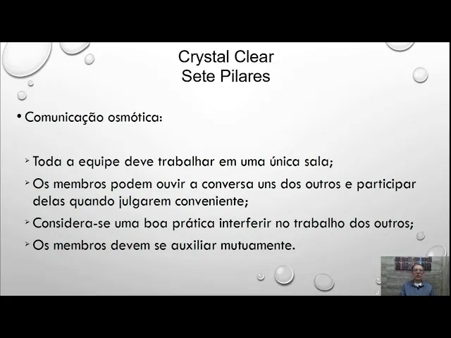 início a nossa aula então como eu falei essa é a quarta aula sobre o sobre processo de desenvolvimento ágeis e nós vamos falar sobre o crstal Clear Então na verdade o crstal clear ele pertence a uma família de métodos Crystal que foi criada pelo cockburn então existem vários métodos Crystal o Crystal Clear é o mais ágil de todos ele é foi desenvolvido para equipes com até oito desenvolvedores alguns autores dizem até 10 mas eu considero até oito desenvolvedores e com nível de risco relativamente pequeno existem outros ã métodos Crystal que vão se tornando mais formais