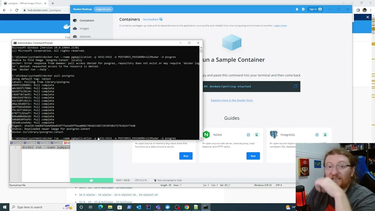 a gravação Porque de fato eu tô usando a mesma máquina para gravar que a máquina do docker Então galera a gente já tá com docker instalado aqui tá ele tem umas peculiaridades Mas pode ver que ele parou de dar erro tá enfim ele já tá certinho então não vou mais mexer com docker aqui ou melhor a gente pode até ganhar tempo né galera e a gente pode pegar procurar instalar já o post-ger que é um banco de dados tá galera vamos fazer o seguinte fazer a pesquisa aqui vai ficar um pouco mais extenso porque não