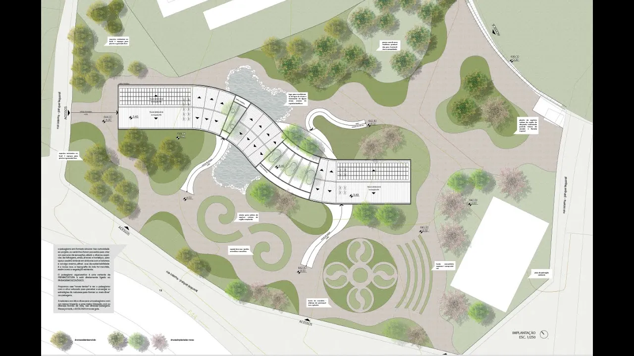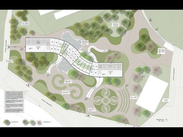 a implantação mostra ela mostra geralmente numa escala 1 para mim ou um para 500 dependendo do tamanho do lote Escalão para 500 é a mais ajustada para a gente mostrar o que é necessário na implantação e ela vai mostrar os limites do terreno a projeção do que está edificado com a planta de cobertura Olá pintor no dessa parte edificada como o projeto do Espaço Aberto então a gente representa muros cercas caminhos percursos todo o projeto do espaço aberto com a projeção da edificação com as copas das Árvores dos arbustos com as shuras dos materiais que