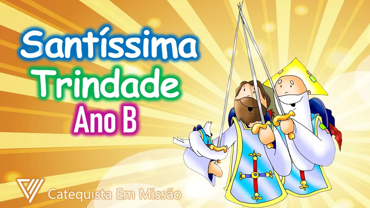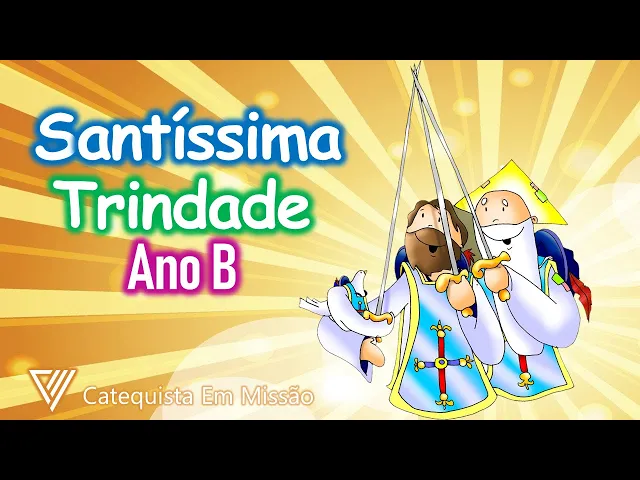 E aí [Música] [Música] a Santíssima Trindade ano o p Oi Hoje vamos falar de um mistério misterioso que só a fé consegue entender o mistério da Santíssima Trindade nós estaremos reunidos em nome do pai do filho e do Espírito Santo amém o evangelho de hoje está no livro de Mateus capítulo 28 Versículos 16 a 20 e há muito tempo atrás os onze discípulos se reuniram em um local um pouquinho mais alto como uma montanha pequenina bem do jeitinho que Jesus havia pedido de repente Jesus apareceu no meio deles e disse mais ou menos assim ó