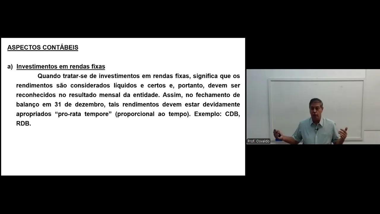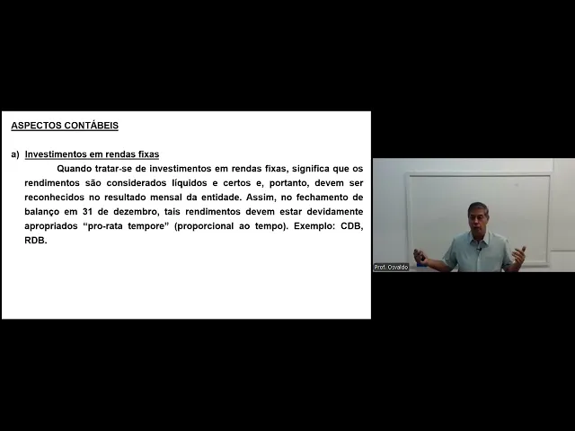 Olá pessoal sejam bem-vindos a mais uma aula eh sobre auditoria a aula passada nós falamos sobre auditoria de caixa equivalente de caixa que envolvia caixa bancos Conta Movimento e bancos conta aplicações imediatas hoje nós vamos falar auditoria sobre aplicações financeiras um um termo um tema bem simples paraa auditoria não tem muito eh problema não existe tantos problemas assim na auditoria de aplicações financeiras é algo bem bem fácil vamos dizer assim tá bom então conforme nós falamos anteriormente as contas do ativo são classificadas em ordem crescente de grau de liquidez tá e as aplicações financeiras normalmente entes normalmente os os resgates dessas aplicações financeiras são de curto prazo e portanto são classificados no ativo circulante tá eh cabe no entanto né cabe uma análise por parte do contador sobre a possibilidade de resgate dessa aplicação financeira caso o prazo de resgate seja considerado longo prazo e se a empresa resgatar antes desse prazo não terá direito aos rendimentos dessa aplicação Então esta aplicação deverá ser contabilizada no ativo não circulante tá eu tô colocando isso aí gente como uma possibilidade tá bom tá vamos vamos exemplificar tá bom normalmente normalmente as aplicações financeiras que nós estamos falando aqui tá é para Olha você tem que deixar aqui um prazo de carência de 3 meses 4 meses 6 meses tá então normalmente esses tipos de aplicações são classificados no ativo circulante mas o que eu tô colocando aqui como uma possibilidade é a empresa fazer um prazo de resgate de 3 anos vamos dizer assim tá vamos exemplificar a empresa faz um prazo de resgato de 3 anos tá E no contrato fica estabelecido olha se com um ano 2 anos ou antes desse vencimento de 3 anos a empresa Resgate e ela perde toda da aplicação financeira existente ela per desculpa ela perde todo o rendimento dessa aplicação Então essa aplicação teria que ir para o não circulante lá no realizável longo prazo tudo bem Tá OK Tá mas hoje a gente sabe que a realidade Nossa não é tanto para isso não tá bom tá a realidade é um prazo de carência de 3 meses 4 meses 6 meses tá que isso aí seria curto prazo mas tá isso é só uma possibilidade dentro do aspecto de auditoria quais seria qual seria o objetivo da auditoria dentro do dentro desse em é realmente comprovar a existência dessa aplicação financeira e se realmente essa aplicação financeira é de propriedade da empresa tá bom ou seja confirmar se realmente essa aplicação existe e se essa aplicação realmente pertence à empresa quais são os principais procedimentos existentes falei que é algo bem simples conferir os saldos contábeis das aplicações com os extratos das aplicações financeiras E caso não exista os extratos atualizados solicitar carta de circularização para as instituições financeiras e verificar a correta contabilização da aplicação ou seja o registro da aplicação o registro dos rendimentos tá se houver imposto de renda retido sobre os rendimentos verificar se o contador está contabilizando corretamente então algo bem simples não requer assim planilhas de cálculo separadas controles separados e tudo mais tá é algo aí que realmente dá para ser feito aí de uma forma bem tranquila bem sossegada eh investimento os aspectos contábeis investimentos em rendas fixas quando tratar-se de de investimentos em rendas fixas significa que seus rendimentos são considerados líquidos e certos e portanto deve ser reconhecido no resultado mensal da entidade assim no fechamento do Balanço em 31 de dezembro Tais rendimentos devem ser devidamente apropriados PR rata tempor tá que quer dizer proporcional ao tempo exemplo desses tipos de aplicações cdbs rdbs e tudo mais que nós estamos querendo dizer aí com isso tá quando for investimentos em rendas fixas tá esse tipo de rendimento já estabelece qual vai ser o valor ganho pela empresa ou seja qual é o rendimento que a empresa vai ter com essa aplicação então traduzindo o contador sabe quanto a empresa vai ganhar então existindo esse tipo de aplicação o contador ou a empresa deve reconhecer esses rendimentos periodicamente em seus resultados Tá beleza então se ela sabe quanto ela vai ganhar tá esses rendimentos tê que ser contabilizados periodicamente tem que ser reconhecidos periodicamente já os investimentos em rendas variáveis tá Nós não sabemos Quanto vai ganhar no final como eu tô falando é rendimento variável tá esses rendimentos eles sofrem alterações eles podem ter um aumento Como pode ter uma queda tá então eu não sei quanto vai ganhar quanto a empresa vai ganhar o contador não sabe quanto a empresa vai ganhar ao final de toda a aplicação do prazo de resg então ele só vai saber o rendimento correto lá no prazo de resgate então não tem como você o contador ficar contabilizando isso periodicamente então o rendimento ele só vai ser apropriado na data do Resgate Porque aí sim a empresa sabe quanto realmente ela ganhou Tá OK Tá então muito cuidado com esses itens exemplo de contabilização de aplicações financeiras em 1 de Março de 2023 uma determinada empresa aplica o valor de R 100. 000 em rendas variáveis então débito de aplicações financeiras 100. 000 crédito de Banco Conta Movimento 100.