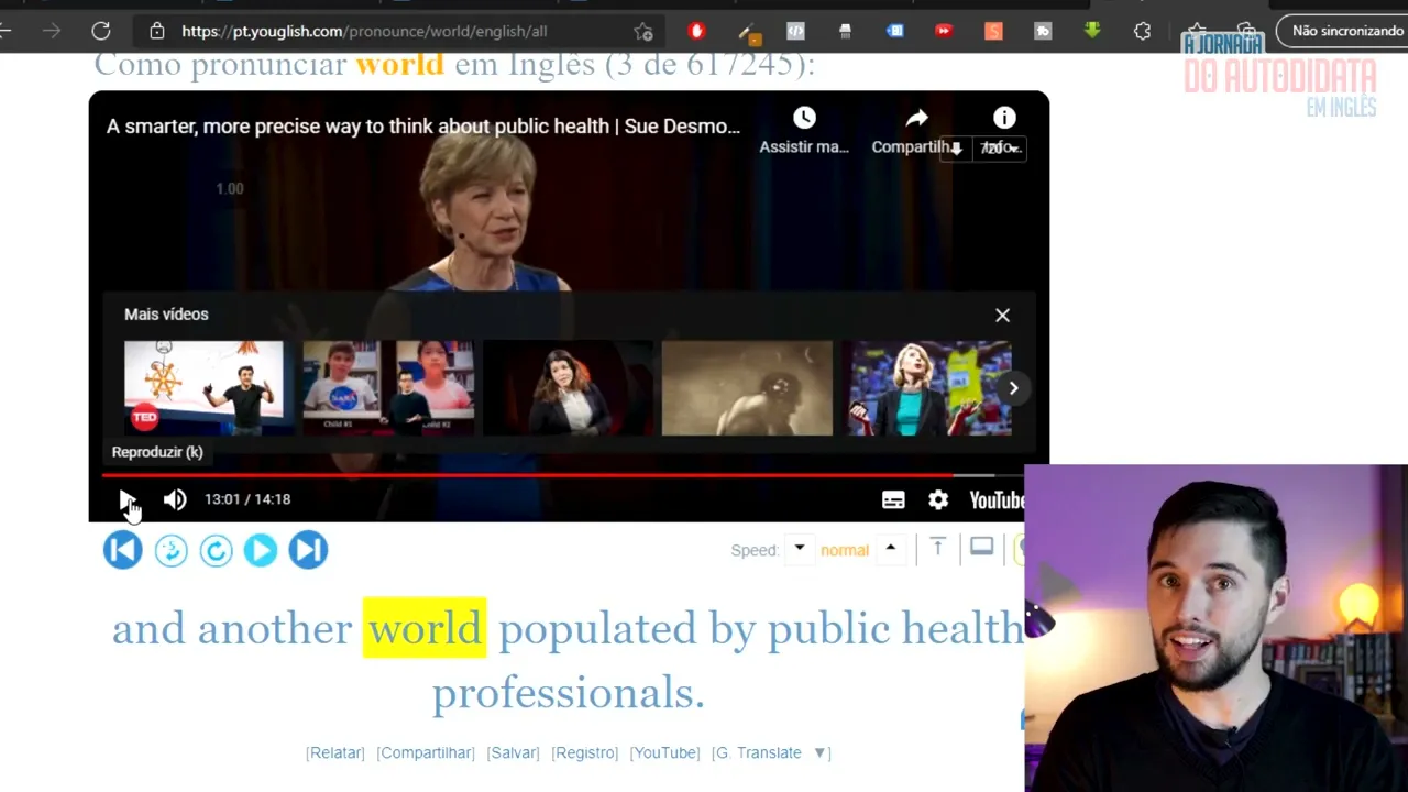 né Isso vai cair esse número aqui de vídeos mas também ele vai procurar por aquela frase nos vídeos outra coisa bem interessante aqui se você clicar em cima das palavras ele vai dar a explicação daquela palavra então vou clicar aqui em World ele vai abrir aqui é o que significa não é o substantivo as explicações todas em inglês tem sinônimos né e tudo mais então tem muita coisa aqui que vai ajudar demais no seu estudo tem outros botões aqui que você pode usar pô eu voltar o vídeo né então eu posso ir voltando os vídeos