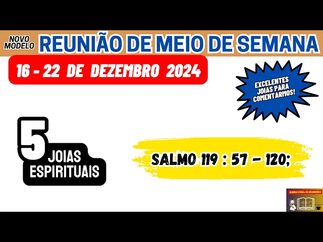 sejam todos bem-vindos ao nosso canal ajuda para as reuniões Esperamos que todos vocês estejam bem e tenham tido uma excelente fim de semana meus queridos irmãos na reunião desta semana 16 a 22 de dezembro nós estaremos considerando a leitura do Salmo 119 versos 57 a 120 esse texto é a base de toda a reunião e como de costume Neste vídeo nós vamos fazer de maneira objetiva uma análise pração de algumas joias espirituais que podemos encontrar e estar comentando nessa parte portanto para aqueles que ainda não fizeram se inscrevam no nosso canal deixem um gostei façam