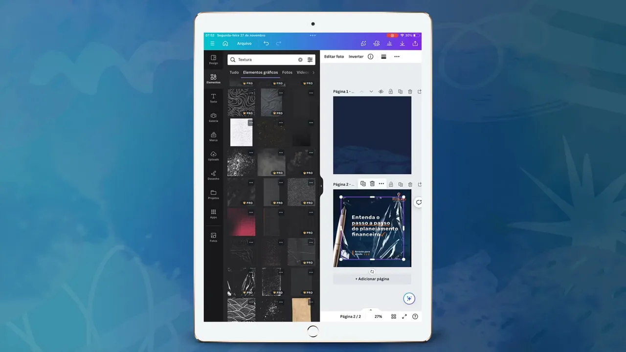 dá para fazer sim mesmo que a gente não saiba mexer no Photoshop vou escolher um design aqui meio básico assim nível um mas antes para vocês já entenderem e conhecendo bastante das funcionalidades do canva tá o que eu escolhi foi esse daqui entendo passo a passo do planejamento financeiro ele é um Carrossel um Carrossel é quando tem mais de um slide então você vê aqui que tem um seis sete e a gente tem que fazer e todo o design para que todos esses sete slides combinem entre si e d dê para entender né dê para