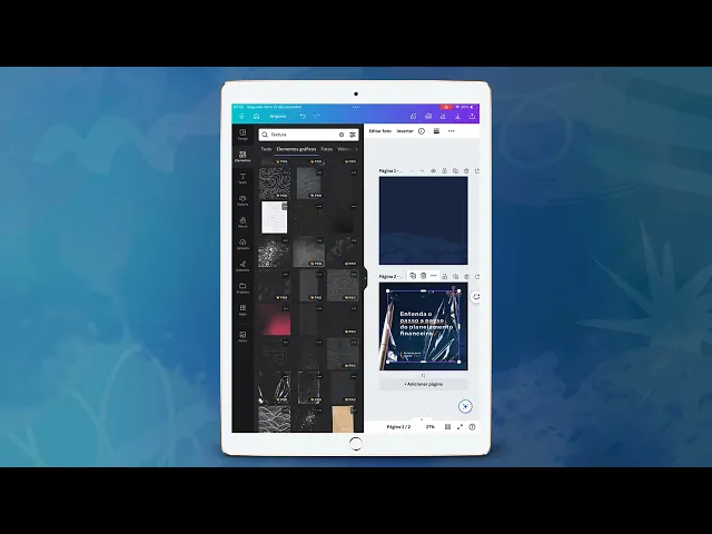 azul e o laranja e o branco também que tem que terem todas para ser algo mais neutro para usar no texto também Começando aqui eh vamos olhar como que tá o nosso design eu gosto de subir ele pro cover então a gente pode clicar aqui em fazer upload fototeca e eu vou selecionar aquele print que eu tinha feito antes para ele ser minha colinha aqui ok então eu vou adicionar uma página clicar e deixar aqui ele embaixo bom então vamos começar com o fundo a gente a gente percebe que tem uma cor aí duas cores