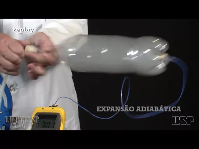 observaremos que ao injetar ar dentro da garrafa como seu volume se mantém constante haverá aumento da pressão Esse aumento da pressão faz a temperatura interna da garrafa aumentar gradativamente Como podemos ver no visor do termômetro com a garrafa pressionada abriremos a tampa de borracha de forma abrupta no momento da descompressão forma-se uma neblina branca dentro da garrafa e a temperatura interna diminui consideravelmente por causa da expansão repentina ela se torna uma transformação praticamente adiabática ou seja sem troca de calor da parte interna com o ambiente o trabalho realizado pelo gás que provocou a expansão diminui