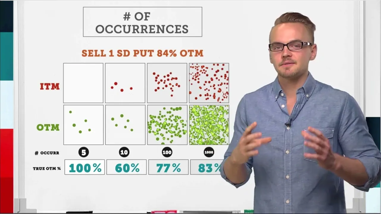 probability of being out of the money and basically you can always calculate that if you just take 100 and subtract any in the money percentage you'll get the out of the money percentage and vice versa so if i have 84 out of the money i know that i've got a 16 in the money percentage here so let's take a look at number of occurrences and we're gonna throw on five occurrences so let's say over the course of five months i sold a one standard deviation put 84 of the money and i let it expire so