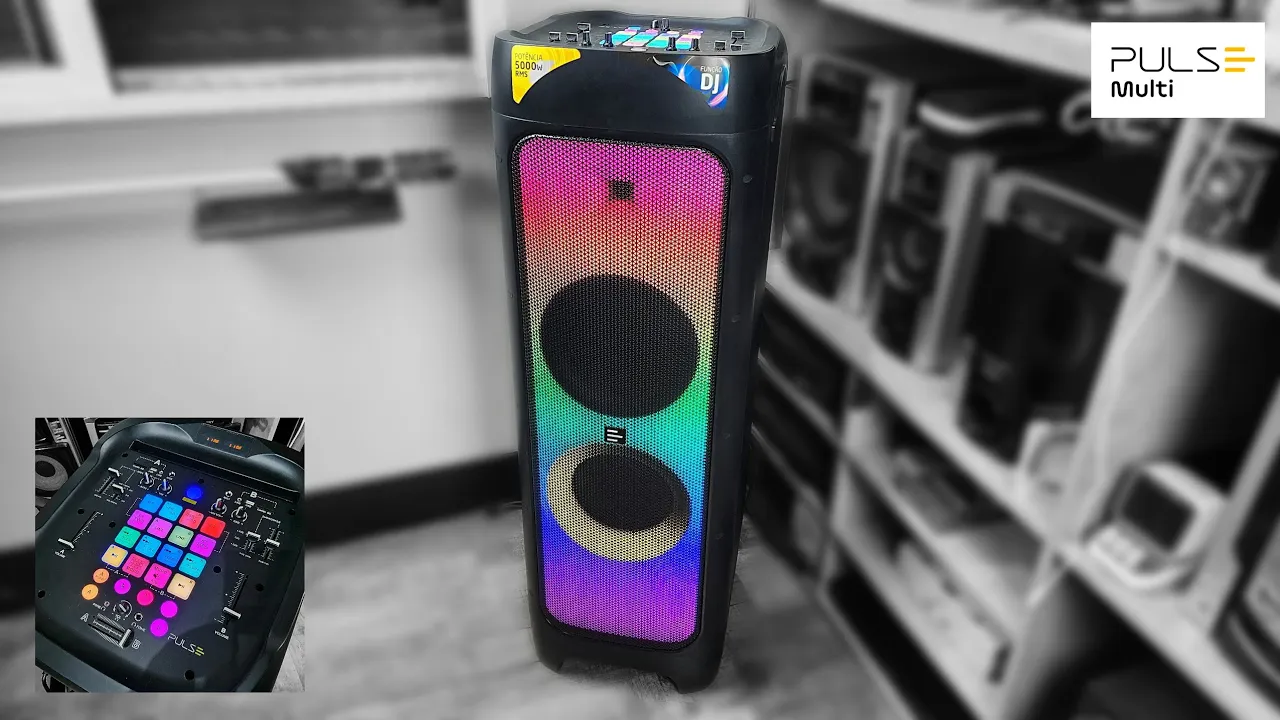 na música e a Graça desse dispositivo de áudio é justamente possuir um subwoofer de 12 polegadas lá embaixo entregando isoladamente os sons de subgrave Então ela realmente é uma caixa de som bastante completa nesse quisito de dar festas tá de parabéns desse ponto aqui s a potência Pois é a Pulse durante todo o seu anúncio dessa caixa de som ficou dizendo que ela entrega 5000 w RMS de potência Total tá aqui atrás informando tá na embalagem tá no manual assim eu não sou técnico para poder aferir de forma correta se ela entrega ou não 5000