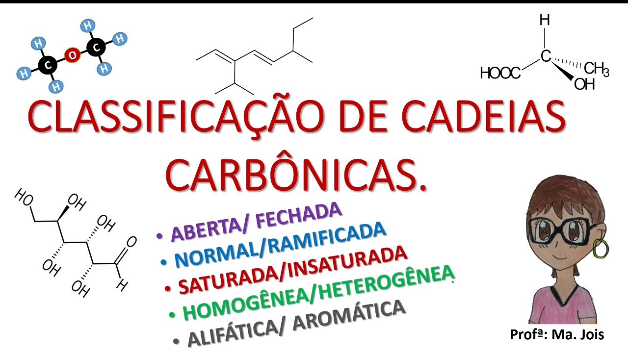 nós estamos de volta com mais uma aula de química e eu sou a professora Joyce que hoje vamos ver as classificações das cadeias carbônicas tá E aí hoje a gente vai ver quatro classificações cadeia pode ser aberta fechada normal ramificada saturada e saturada e homogênea e heterogênea vamos entender cada uma delas aí tá primeira classificação aberta ou fechada como é que é um diferencia uma da outra gente cadeia aberta é aquela que aquela cadeia que possui duas ou mais extremidades Livres Tá como assim e professora gente olha só aqui ó essa ponta que esse Carbone