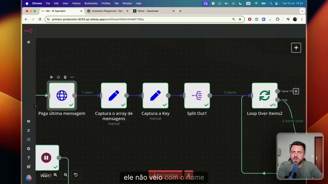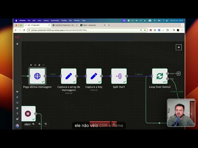 entender porque senão a gente vai tratar alguns nozinhos que a gente que vocês já conhecem para fazer isso tá então como é que é o primeiro passo eu vou testar esse workflow Enquanto isso vou deixar rodando aqui tá mas eu vou vir aqui no meu assistente tá então esse aqui o assistente que eu tô utilizando lá naquela automação que eu tô mostrando para vocês que é o Bot de agendamento que a gente vai ensinar na cer ação Beleza então ó com Rad tá até aqui o nome que que acontece a primeira etapa que a gente