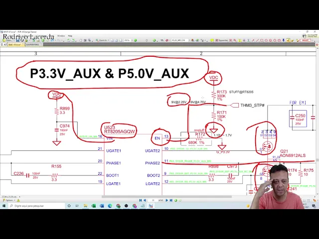 3 V6 está entrando aqui e alimentando-a super aí ó Vocês conseguem ver aqui pois é então ela é uma atenção que só de plugar a fonte tem que estar bem que ela tem que aparecer toda forma deixa só coloca aqui que eu quero eu queria palavra toda por que que ele tá fazendo bom então mostrando tudo aqui tudo bem vamos continuar aqui vão uns que ela nasce tá foi mim poder saber aonde que ela mas eu estou procurando ou pwm primário né olha só tô procurando pegar para mim primário faz nada tá e eu sei mais ou menos na minha cabeça como é que é o desenho daquele pwm queimar e como é que é então vamos ver aqui sem te encontra tá é por isso que eu vou trocando aqui enquanto eu não vejo o desenho mais ou menos ó esse aqui eu já vi um desenho parecido Será que aqui e é que mesmo olha só tá vendo como que é o desenho parecido que eu falo é aqui o pwm tá E aqui eu vejo saindo os mosfets de alta mosfet de baixa a pele e ele sai aqui ó tá vendo ele sai com o nome dele aqui OK tá marcando se você não não tô conseguindo ler ele está mostrando para mim que é mais 3. 3 V ou seis Tá bom Vamos ver se esse pwm aqui também tem um me rege tenho ele tem um ver red3e também deve ter o Régis 5 em algum lugar que eu vejo cinco está aqui ó tá então uma é head três dele chama E aí é mais 3.
