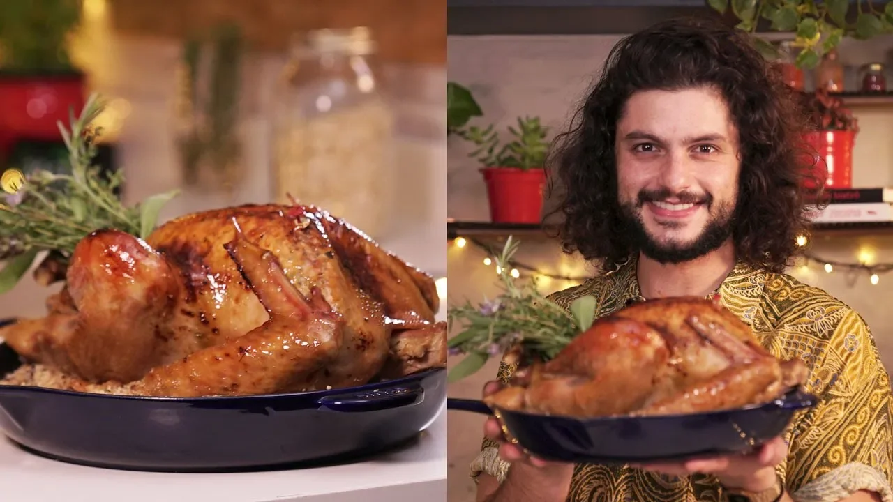 [Música] parece clichê mas chegou a época mais gostosa do ano e não é só a gostosa por causa da comida mas sim por unir as pessoas que você gosta por isso que hoje eu vou ensinar pela primeira vez aqui no canal a fazer um delicioso suculento e lindo peru de natal [Música] vou começar pela estrela que é o nosso peru sadia que ele está com aproximadamente quatro quilos e meio mas se você quiser um pouco maior tem também uma coisa muito importante tirar ele do congelador com pelo menos 48 horas você ficar seguro que vai