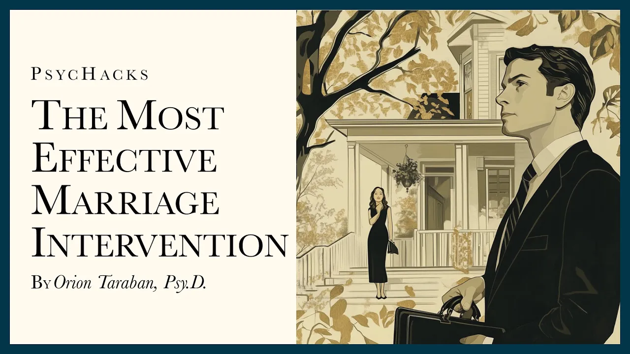 I'm Dr Orion terban and this is psycha Better Living Through psychology and the topic of today's short talk is the most effective marriage intervention so today I'm going to talk about the one thing that has single-handedly saved more marriages than any other intervention in the history of relationships it's not couples's therapy it's not effective communication it's not a safe place to be vulnerable with each other in a non-defensive non-judgmental I see you seeing me seeing you kind of a way and it's not anything else that your culture generally tells you is supposed to work to