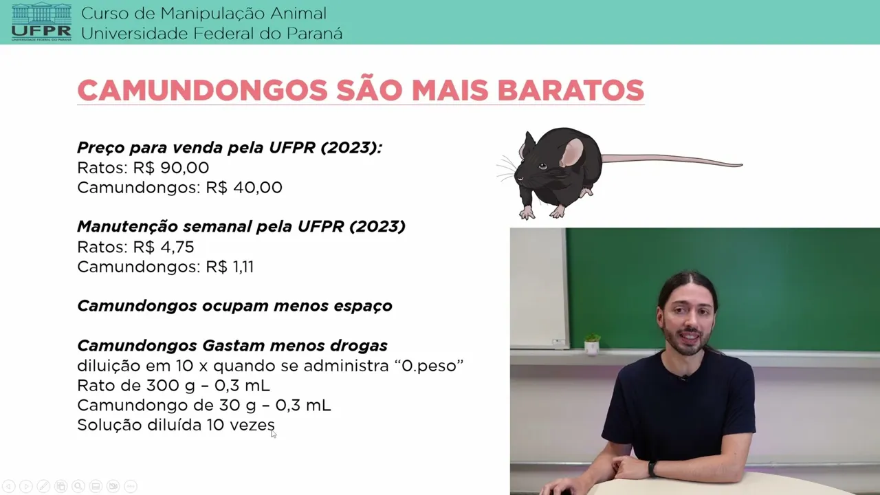como que a gente escolhe entre ratos ao camundongos como coordenador de biotério especialmente coordenador não técnico do biotério uma função mais gestora então que envolve orçamento e recursos eu não posso deixar de pensar no preço Então se para o seu modelo não faz diferença ratos ou camundongos Eu recomendo que você utilize camundongos porque olha aqui o preço para venda pela UFPR para instituições externas ratos custam r$ 90 cada rato e camundongos 40 a manutenção semanal com tudo só ração e maravalha ratos quatro e setenta e cinco por semana por rato e camundongos um real e