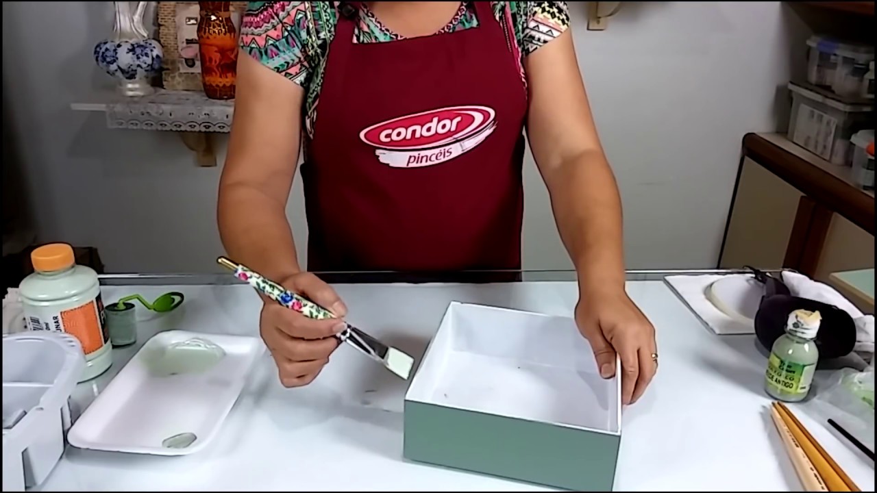 [Música] e aí gente vocês me pediram e eu trouxe o tutorial de como pintar uma caixa de mdf o efeito assim mais profissional na verdade existem várias formas de fazer eu vou ensinar uma delas a que eu testei a que eu faço e que funciona muito bem pra mim eu espero que funcione para vocês também é isso vamos deixar de enrolação e vamos lá pro setorial então a gente vai precisar da caixa é de mdf vou usar dois pincéis é que aqui eu peguei uma lixa um paninho e um papel kraft e como você vai