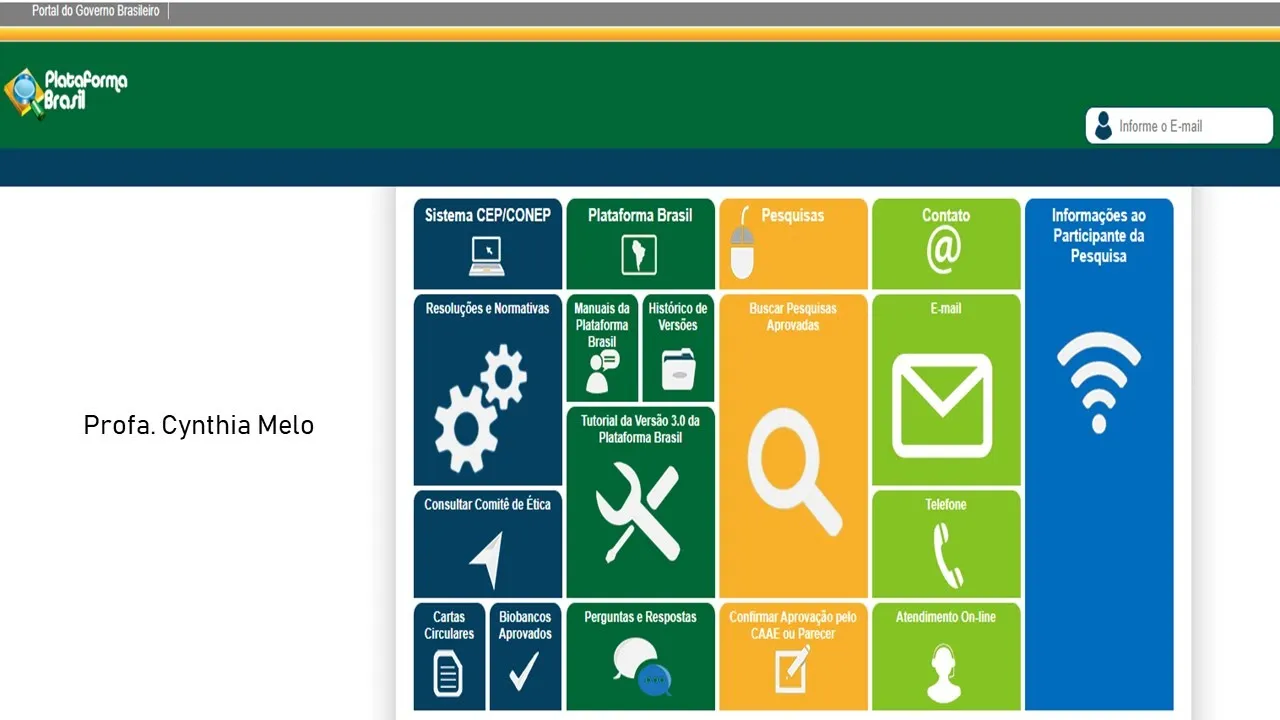 Olá bom dia a todos aqui é a professora cincha Melo coordenadora do laboratório de estudos e práticas em psicologia e saúde e hoje a gente vai estar mostrando um vídeo sobre a inclusão de projeto de pesquisa na plataforma Brasil Estou com vários alunos que precisam fazer isso nesse momento e estão tendo algumas dificuldades então para facilitar eh as futuras inclusões de cada aluno a gente vai est aí mostrando esse processo como ele é feito tá chama atenção primeiro que De forma alguma eh é eh objetivo desse vídeo tratar sobre o conteúdo tá de cada parte