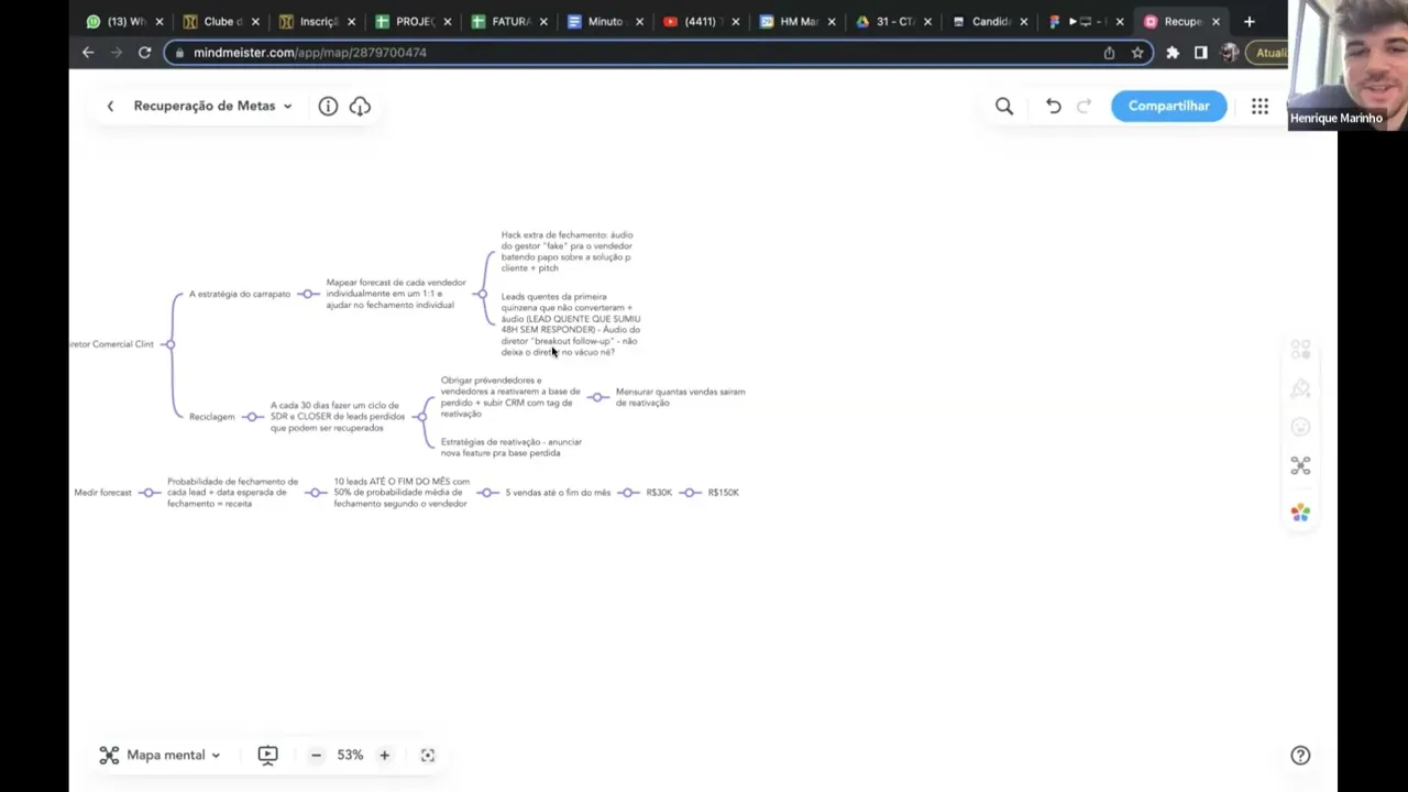 que é disparar e-mail fazer reativação de B Começamos também com o social selling mais ativo uma das estratégias social selling foi liberar a agenda do Henrique e que os os era cinco ou era 10 melhores negócios iam ter uma sessão estratégica com Henrique e nisso a gente teve uma onda de de aplicações muito grandes e a gente vai aproveitando isso para jogar pro time comercial eh fazer sessão estratégica tivemos Fala aí quer abrir a câmera Quer compartilhar pode abrir E aí fica à vontade não ligo de rapidinho Gente só antes de você passar os números