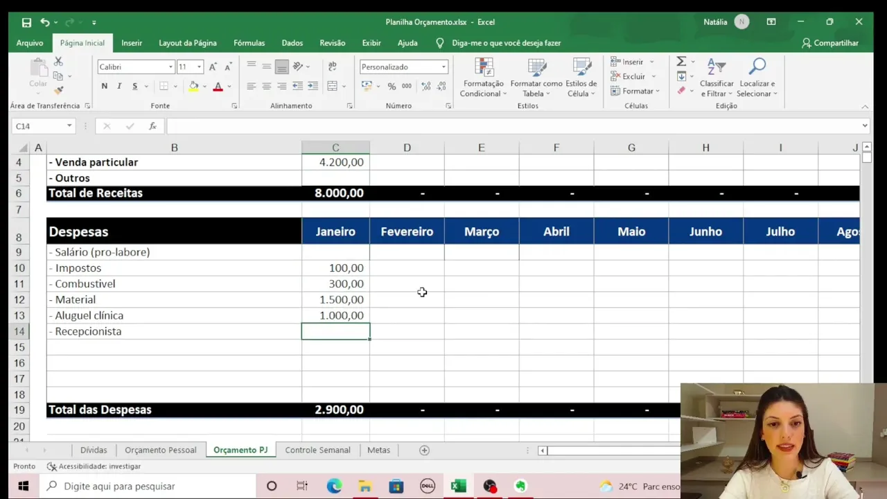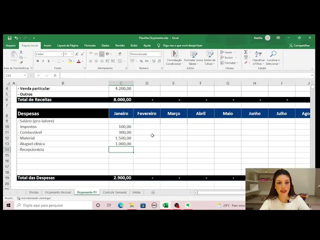 e agora essa é a planilha de orçamento PJ pessoas jurídicas que é do seu negócio eu fiz o orçamento da Mariquinha Mariquinha ela tem um salário fixo mais uma comissão agora nós vamos fazer um orçamento de uma pessoa jurídica que é da Joana perfeito Joana Ela é dentista e por isso ela trabalha também como como ver e particular e ela tem algumas despesas dentro do mês dela como que funciona esse orçamento da Juan bom então primeiro a gente vai estar as receitas igualmente na outra no outro orçamento mensal pessoal e as despesas e aqui nós estabelecemos um salário a Joana ela fez a média dos últimos seis meses de recebimento dela ficou então em torno de três mil e oitocentos de convênio particular se contorno de 4. 200 totalizando oito mil reais por mês de receitas primeira Então já estabelecemos a receita e e não são todos os três 800 não são todos os meses que entra quatro dos dentes mas considerando uma média dos últimos seis meses Joana recebe de convênio 3800e particular 4 200 muito importante ter claro que esses três 800 já é líquido Porque como é que o governo tem uma tem um imposto cobrado em cima de quanto ela recebe e para ela cai na conta dela 3. 800 sempre tem mente que aqui é o quanto cai na sua conta tá por exemplo você vende com maquininha de cartão você precisa desconsiderar a taxa da maquininha Só realmente caiu na sua conta que ao Quando você vai poder usar para gastar e pagar conta vamos lá uma função bom Joana paga impostos do convênio já escutado automaticamente Então ela já já foi pago só que da parte da venda particular ela precisa pagar imposto que fica em torno de cem reais no mês combustível Joana precisa de combustível para ir trabalhar certo então combustível que ela tem para ir trabalhar ela e aqui tem uma despesa da vida J dela você me fala assim olha eu uso combustível para a vida pessoal e tá minha vida de pessoa jurídica sabe tudo junto eu não sei quanto eu uso para casa você faz meio a meio ou você faz as contas de quanto você gasta para ir para o trabalho como você vai fazer essa conta quantos quilômetros por litro faz o seu carro quantos dias na semana você vai para lá e qual o valor do litro do combustível tá E aí você consegue chegar no quanto você gasta de combustível somente para ir ao trabalho que também vai ser um valor variável mas é legal ter uma média aqui no limite tá é uma graça presenciais de combustível por mês para ir à praia do trabalho o material dela gira em torno de 1.