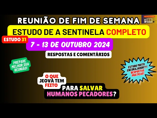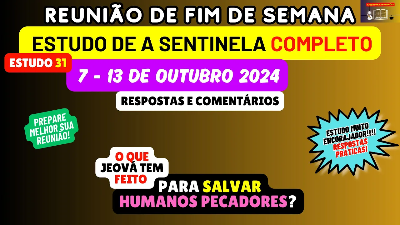 Neste vídeo vamos de maneira objetiva fazer uma análise e preparação do estudo 31 da revista Sentinela este artigo vai ser considerado na reunião deste fim de semana 7 a 13 de outubro portanto Esperamos que cada um de vocês possam tirar bastante proveito Dos comentários e das respostas desta preparação [Música] o título do estudo 31 é um tema muito emocionante o que Jeová tem feito para salvar humanos pecadores tem como quase um texto que conhecemos bastante João Capítulo 3 Versículo 16 que diz Deus amou tanto o mundo que deu seu filho unigênito qual vai ser o