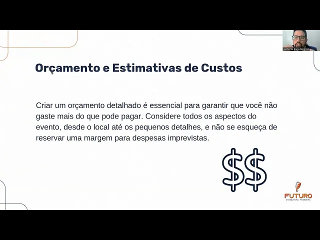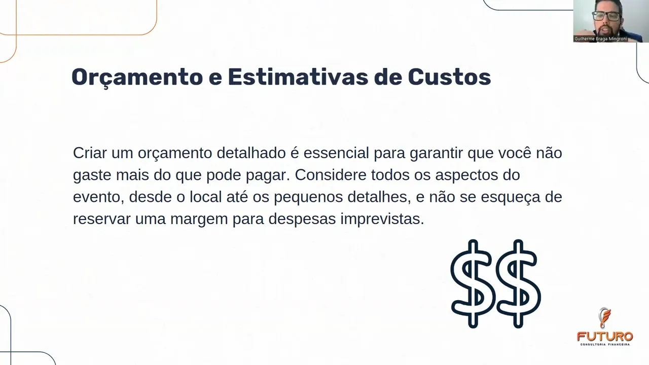 foi T seu Gui Vai lá boa noite galera boa noite bem-vindos aqui mais um workshop da futuro né agora exclusivo aí pra gente falar um pouquinho sobre planejamento de casamento e grandes festas né grandes eventos quem aqui já imaginou ali ter aquela grande festa aquele grande evento principalmente o casamento né acho que é o sonho da maioria aí do dos brasileiros tem aquela festona chamar todo mundo né participar né algo bem deslumbrante assim né então hoje a vai falar um pouquinho sobre esse tipo de planejamento que lógico uma festa bem planejada bem estruturada Assim fica muito mais gostoso de participar dela né de conviver ali com os familiares de fazer tudo aquilo que a gente mais gosta né e retribuí-lo também com esse evento magnífico bom vou me apresentar um pouco antes eu me chamo Guilherme Braga eh mingrone eu sou um dos planejadores financeiros aqui da futuro eh moro na cidade de Leme interior de São Paulo eh e o hoje a gente tá aqui para aprofundar um pouco mais nesses casos né assim como o fe falou né vamos trazer para vocês um pouco mais sobre esse planejamento um pouco mais aprofundado de como fazer essas festas né O que que a gente tem que analisar de risco O que que a gente tem que olhar ali com mais carinho D mais atenção na hora de um planejamento para que esse evento fique ainda mais eh deslumbrante ainda mais cativante para todo mundo que for participar assim tá bom começando com vocês o que que eu quero passar de início né a gente imaginar essa festa já acontecendo pô imagina aquele cenário incrível todo mundo chegando na festa se Se cumprimentando todos os amigos familiares né Eh aqueles olhares assim nossa olha que festa linda que festa maravilhosa geralmente aquela sensação né de Aconchego eh que eles vem todo o esforço tudo aquilo que vocês criaram durante um tempo se dedicaram para comemorar esse dia tão especial de vocês seja um casamento seja uma grande festa né Então tudo isso planejado cuidadosamente tem um go um gosto diferente né Por qu você sabe que aquilo vai ser muito satisfatório para todo mundo e financeiramente falando a gente vai est muito bem estruturado também né Eh um dos principais eh pontos assim né que eu vivenciei com a minha carreira de planejador foi organizar esses grandes eventos essas grandes festas também pros meus clientes tá então é um momento único a gente tem que dedicar muita atenção e muito esforço para esse momento seja cada vez mais importante para vocês né Eh só que para chegar nesse momento tão desl que é um casamento todo mundo passa por alguns desafios né Eh e o maior desafio de todos assim por uma grande festa né quando a gente fala de um planejamento financeiro para um evento desse porte eh a gente tem que olhar desde altos custos ali pensando em local que vai ser a festa eh lista de convidados a pressão social tipo pai e mãe nossa tem que ser uma festa assim tem que convidar Fulano tem que fazer tal coisa tem que ter uma mesa de presente a mesa de bolo cara tem um monte de coisa fotógrafo várias coisas que são um desafio da gente fazer um levantamento e enfrentar essas despesas por qu o mercado de de eventos ele é muito mas é muito agregado valores tá Por quê você tem que contratar vários serviços vários tipos de serviços eh e cada um tem um alto custo tem um valor ali para enfrentar essas despesas Então se a gente não tiver muito bem planejado muito bem eh calculado né ter feito um fluxo de caixa certinho para esses eventos o desfalque é grande e sempre vai ter algum imprevisto Então são alguns desafios financeiros que a gente acaba tendo que enfrentar e olhar para isso para que esse evento se torne algo deslumbrante se torne algo que vocês realmente vão ter um retorno financeiro ali incrível tá e o retorno financeiro em volta disso é a felicidade na no na carinha de cada um das pessoas que vocês convidaram dos seus familiares tá recentemente eu conheci um casal né que tinha esse esse objetivo né Tá extremamente empolgado tava querendo já fazer o casamento há um tempo eh e começaram a reservar ali né horários para falar com fornecedores sentar para conversar com a galera e analisar custos no final eles descobriram que tiveram uma surpresa muito além do orçamento que eles prepararam E isso acontece muito tá Por quê a gente quer o melhor fotógrafo da região a gente quer o melhor local aquela Fazenda linda maravilhosa para fazer o evento só que às vezes a realidade não equipara ali né financeiramente falando porque tem um custo alto tem H tudo isso e pior ainda gente deixar para fazer de última hora tá por exemplo Ah vou casar em outubro você começar a ver agora já é de última hora então a gente tem que se antecipar para que isso não aconteça tá por qu esses desafios né esses essas obstáculos que acabam tendo durante um planejamento de uma grande festa de um evento até mesmo de um casamento eh é por falta de definição de objetivos Então a gente tem que se definir né tem que ser traçado alguns objetivos para você não ultrapassar essas margens né então você tem que estar muito claro para vocês tem que tá muito desenhado ã no orçamento principalmente para que esse evento aconte da melhor maneira possível então a gente determinar prioridades por exemplo vamos puxar o casamento aqui né uma prioridade do casamento seria o quê o local lista de convidados o bifê senão não acontece a festa tem que ter o vestido da Noiva tem que ter Então tudo a gente tem que definir eh O que é prioridade e o que não é tão prioridade assim né então ter essa lista ter esses objetivos muito bem Claros já vai trazer para vocês eh aonde é possível economizar aonde a gente consegue atuar de maneira mais assertiva em economia quanto a isso por exemplo ao invés de buscar lá eh 1000 docinhos para festa pô será que não dá paraa gente buscar al uns 800 será que não vai já agradar todo mundo que Às v